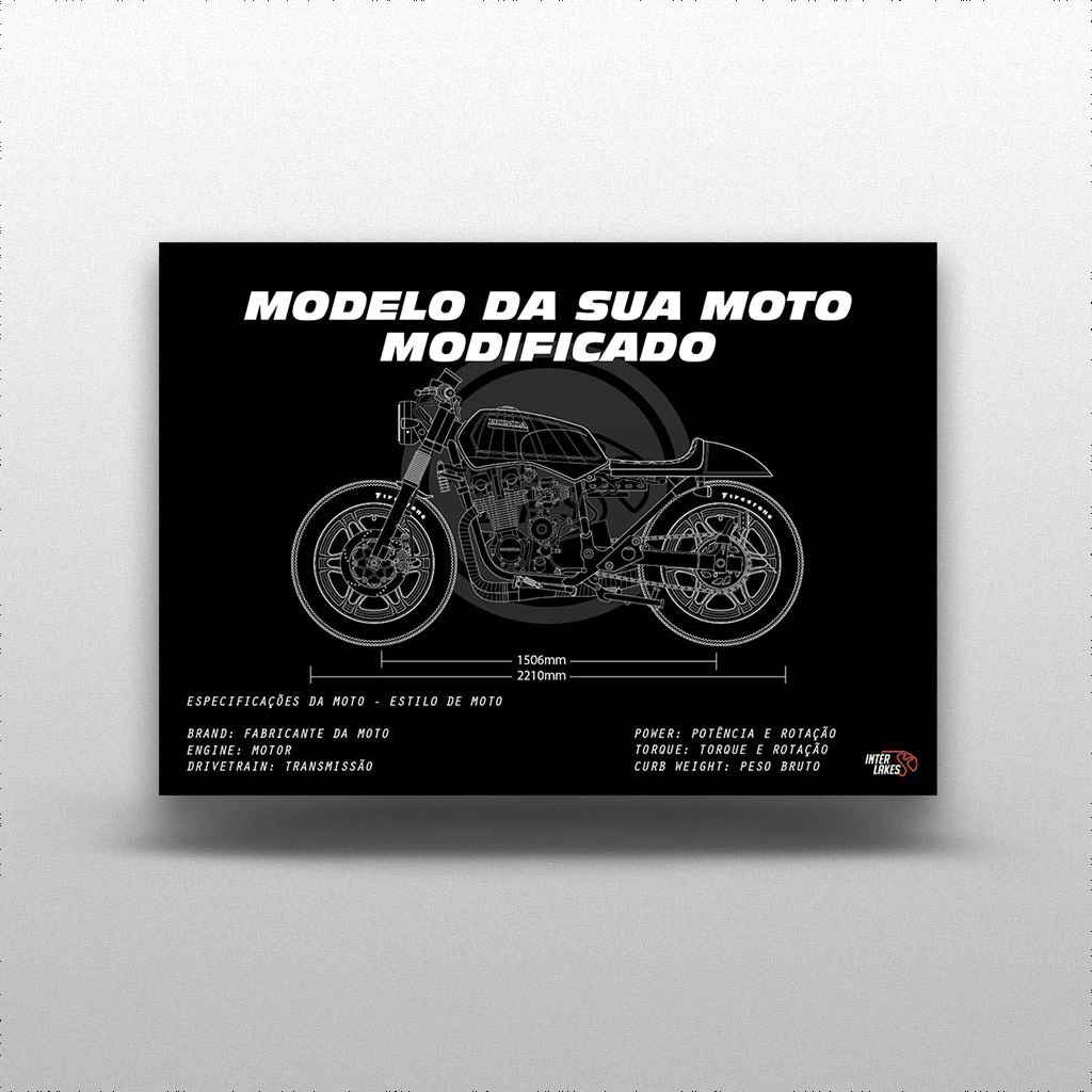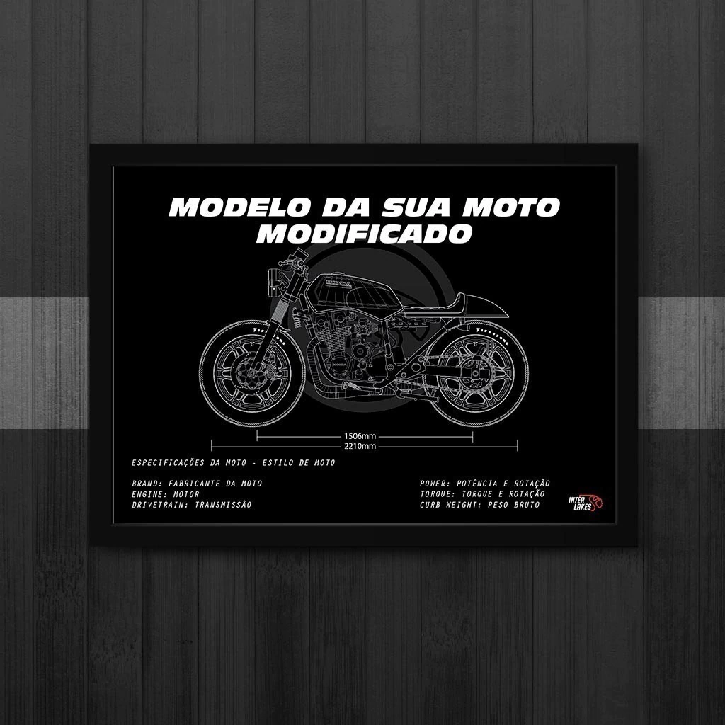 Traga o FAÇA A SUA MOTO | PRETO & BRANCO para fazer parte da decoração da sua casa, seja ele uma parte da sua história, esteja na sua garagem ou ainda exista apenas nos seus sonhos. Eternize a máquina que faz seu coração bater mais forte com um quadro decorativo exclusivo da Interlakes. Este quadro no ESTILO PRETO E BRANCO apresenta uma blueprint/desenho técnico detalhado com as visões lateral, frontal e traseira (front view, side view, rear view) com ficha técnica das especificações do veículo, permitindo que você transforme seu lar em um verdadeiro templo para suas paixões em duas rodas. Adquira agora esta impressionante arte do FAÇA A SUA MOTO | PRETO & BRANCO e eleve o estilo do seu ambiente.