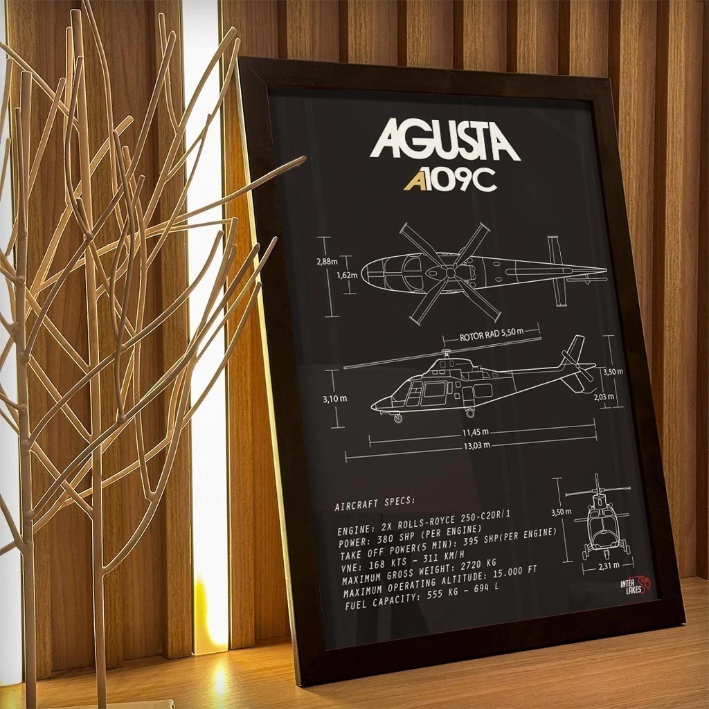 Traga o AGUSTA A109 C para fazer parte da decoração da sua casa, seja ele uma parte da sua história, esteja no hangar ou ainda exista apenas nos seus sonhos. Eternize a máquina que faz seu coração bater mais forte com um quadro decorativo exclusivo da Interlakes. Este quadro no ESTILO PRETO E BRANCO apresenta uma blueprint detalhada com as visões lateral, frontal e traseira (front view, side view, rear view), permitindo que você transforme seu lar em um verdadeiro templo para suas paixões aéreas. Adquira agora esta impressionante arte do AGUSTA A109 C e eleve o estilo do seu ambiente.