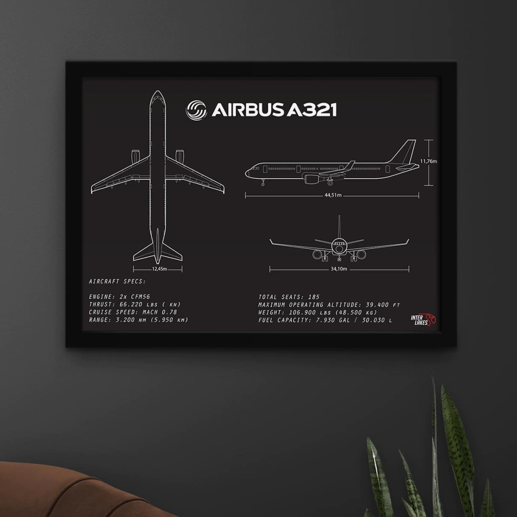 Traga o AIRBUS A321 para fazer parte da decoração da sua casa, seja ele uma parte da sua história, esteja no hangar ou ainda exista apenas nos seus sonhos. Eternize a máquina que faz seu coração bater mais forte com um quadro decorativo exclusivo da Interlakes. Este quadro no ESTILO PRETO E BRANCO apresenta uma blueprint detalhada com as visões lateral, frontal e traseira (front view, side view, rear view), permitindo que você transforme seu lar em um verdadeiro templo para suas paixões aéreas. Adquira agora esta impressionante arte do AIRBUS A321 e eleve o estilo do seu ambiente.