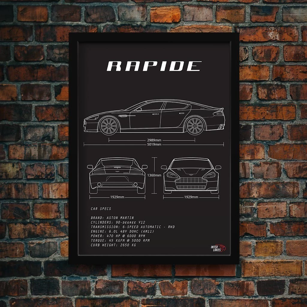Traga o ASTON MARTIN RAPIDE 2011 para fazer parte da decoração da sua casa, seja ele uma parte da sua história, esteja na garagem ou ainda exista apenas nos seus sonhos. Eternize a máquina que faz seu coração bater mais forte com um quadro decorativo exclusivo da Interlakes. Este quadro no ESTILO PRETO E BRANCO apresenta uma blueprint/desenho técnico detalhado com as visões lateral, frontal e traseira (front view, side view, rear view) com ficha técnica das especificações do veículo, permitindo que você transforme seu lar em um verdadeiro templo para suas paixões automotivas. Adquira agora esta impressionante arte do ASTON MARTIN RAPIDE 2011 e eleve o estilo do seu ambiente.