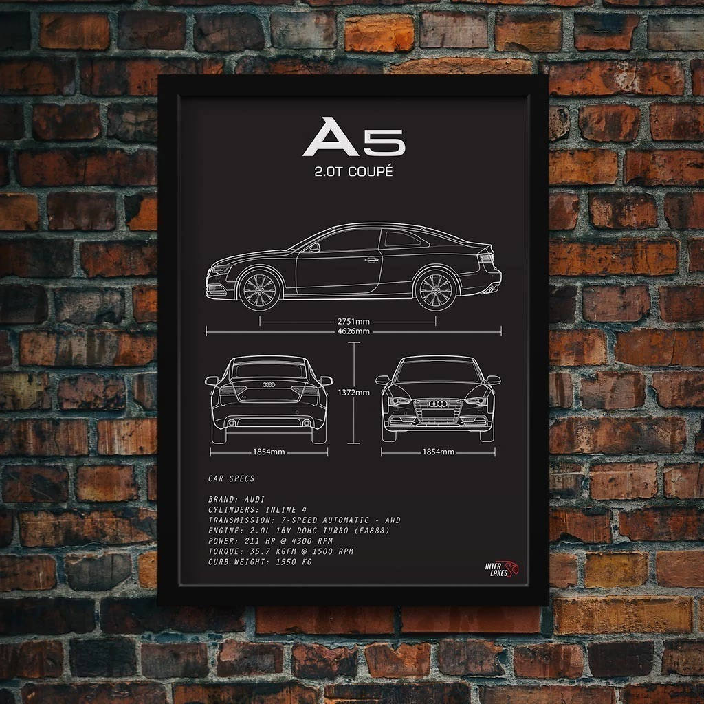 Traga o AUDI A5 2.0 COUPE 2013 para fazer parte da decoração da sua casa, seja ele uma parte da sua história, esteja na garagem ou ainda exista apenas nos seus sonhos. Eternize a máquina que faz seu coração bater mais forte com um quadro decorativo exclusivo da Interlakes. Este quadro no ESTILO PRETO E BRANCO apresenta uma blueprint/desenho técnico detalhado com as visões lateral, frontal e traseira (front view, side view, rear view) com ficha técnica das especificações do veículo, permitindo que você transforme seu lar em um verdadeiro templo para suas paixões automotivas. Adquira agora esta impressionante arte do AUDI A5 2.0 COUPE 2013 e eleve o estilo do seu ambiente.