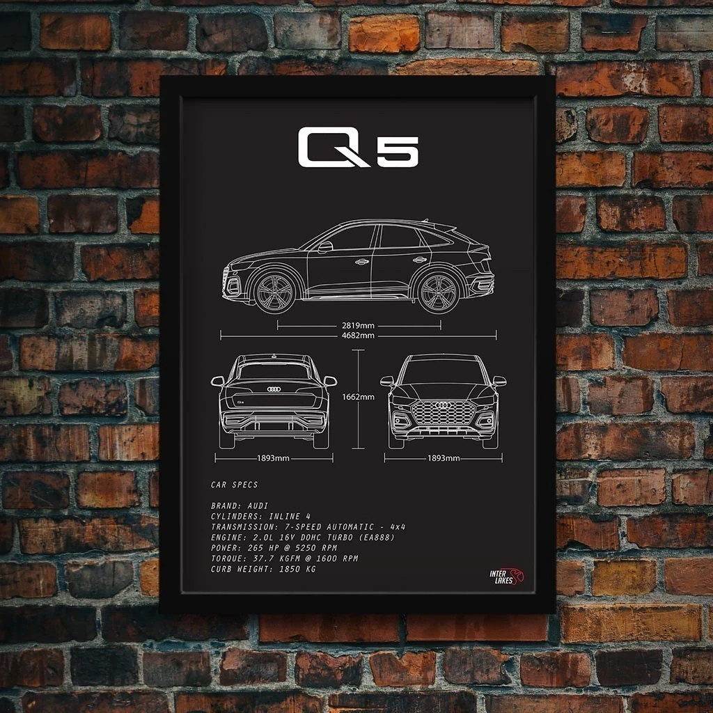 Traga o AUDI Q5 2.0 2022 para fazer parte da decoração da sua casa, seja ele uma parte da sua história, esteja na garagem ou ainda exista apenas nos seus sonhos. Eternize a máquina que faz seu coração bater mais forte com um quadro decorativo exclusivo da Interlakes. Este quadro no ESTILO PRETO E BRANCO apresenta uma blueprint/desenho técnico detalhado com as visões lateral, frontal e traseira (front view, side view, rear view) com ficha técnica das especificações do veículo, permitindo que você transforme seu lar em um verdadeiro templo para suas paixões automotivas. Adquira agora esta impressionante arte do AUDI Q5 2.0 2022 e eleve o estilo do seu ambiente.
