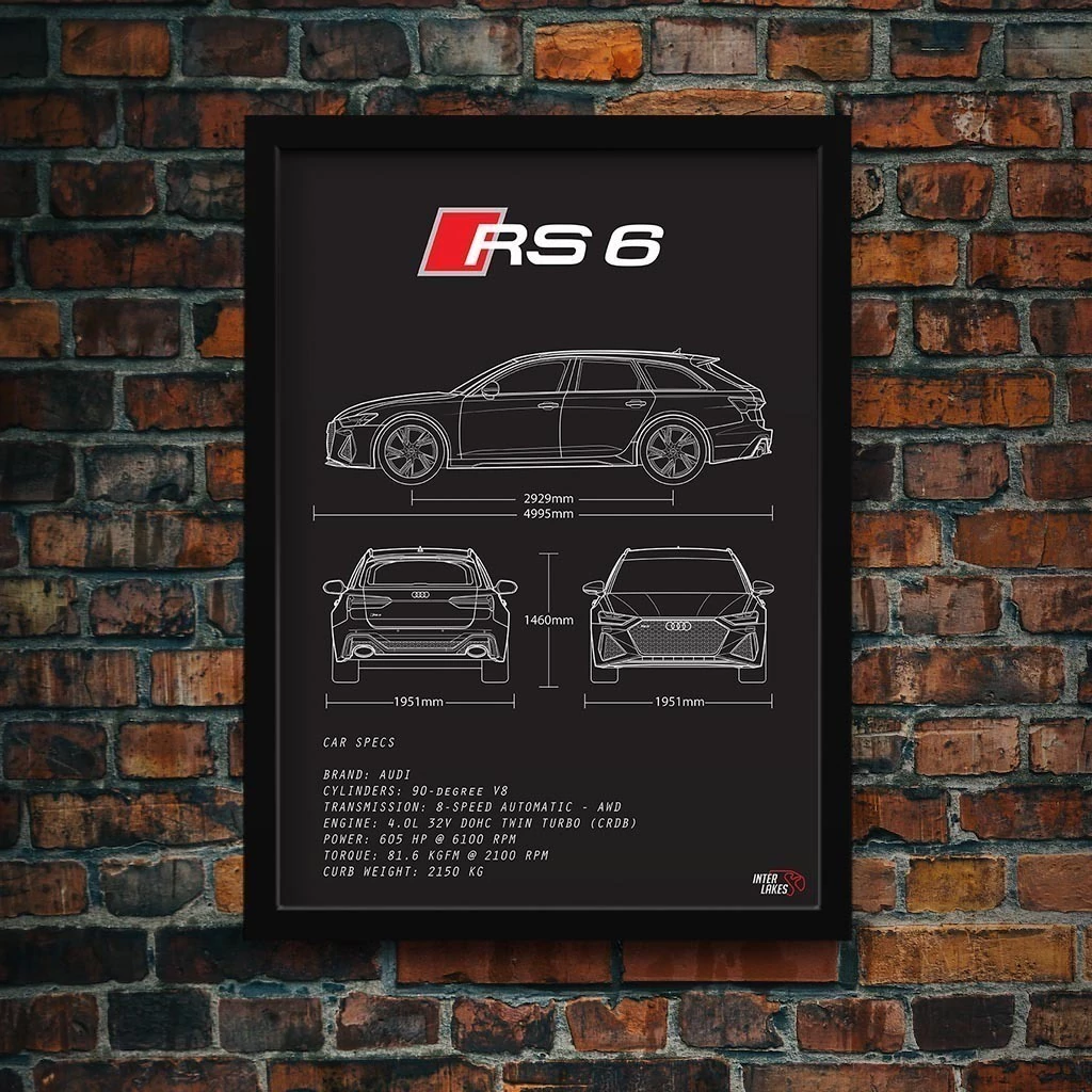 Traga o AUDI RS6 C8 AVANT para fazer parte da decoração da sua casa, seja ele uma parte da sua história, esteja na garagem ou ainda exista apenas nos seus sonhos. Eternize a máquina que faz seu coração bater mais forte com um quadro decorativo exclusivo da Interlakes. Este quadro no ESTILO PRETO E BRANCO apresenta uma blueprint/desenho técnico detalhado com as visões lateral, frontal e traseira (front view, side view, rear view) com ficha técnica das especificações do veículo, permitindo que você transforme seu lar em um verdadeiro templo para suas paixões automotivas. Adquira agora esta impressionante arte do AUDI RS6 C8 AVANT e eleve o estilo do seu ambiente.