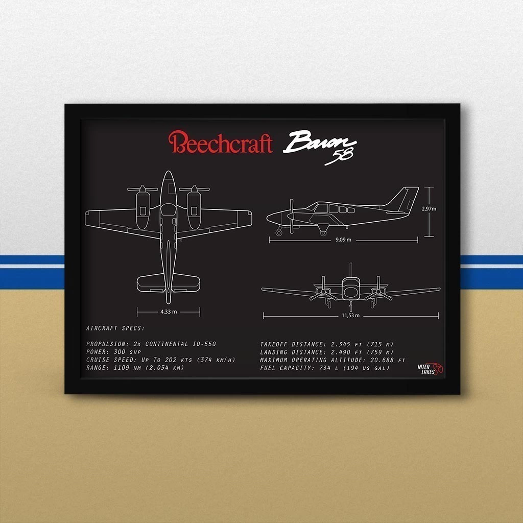 Traga o BEECHCRAFT BARON 58 para fazer parte da decoração da sua casa, seja ele uma parte da sua história, esteja no hangar ou ainda exista apenas nos seus sonhos. Eternize a máquina que faz seu coração bater mais forte com um quadro decorativo exclusivo da Interlakes. Este quadro no ESTILO PRETO E BRANCO apresenta uma blueprint detalhada com as visões lateral, frontal e traseira (front view, side view, rear view), permitindo que você transforme seu lar em um verdadeiro templo para suas paixões aéreas. Adquira agora esta impressionante arte do BEECHCRAFT BARON 58 e eleve o estilo do seu ambiente.