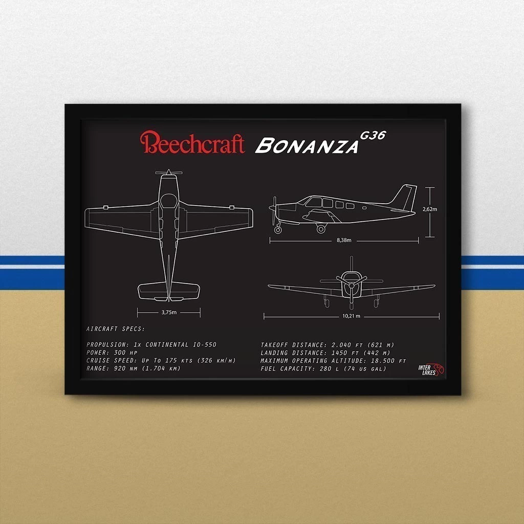 Traga o BEECHCRAFT BONANZA G36 para fazer parte da decoração da sua casa, seja ele uma parte da sua história, esteja no hangar ou ainda exista apenas nos seus sonhos. Eternize a máquina que faz seu coração bater mais forte com um quadro decorativo exclusivo da Interlakes. Este quadro no ESTILO PRETO E BRANCO apresenta uma blueprint detalhada com as visões lateral, frontal e traseira (front view, side view, rear view), permitindo que você transforme seu lar em um verdadeiro templo para suas paixões aéreas. Adquira agora esta impressionante arte do BEECHCRAFT BONANZA G36 e eleve o estilo do seu ambiente.