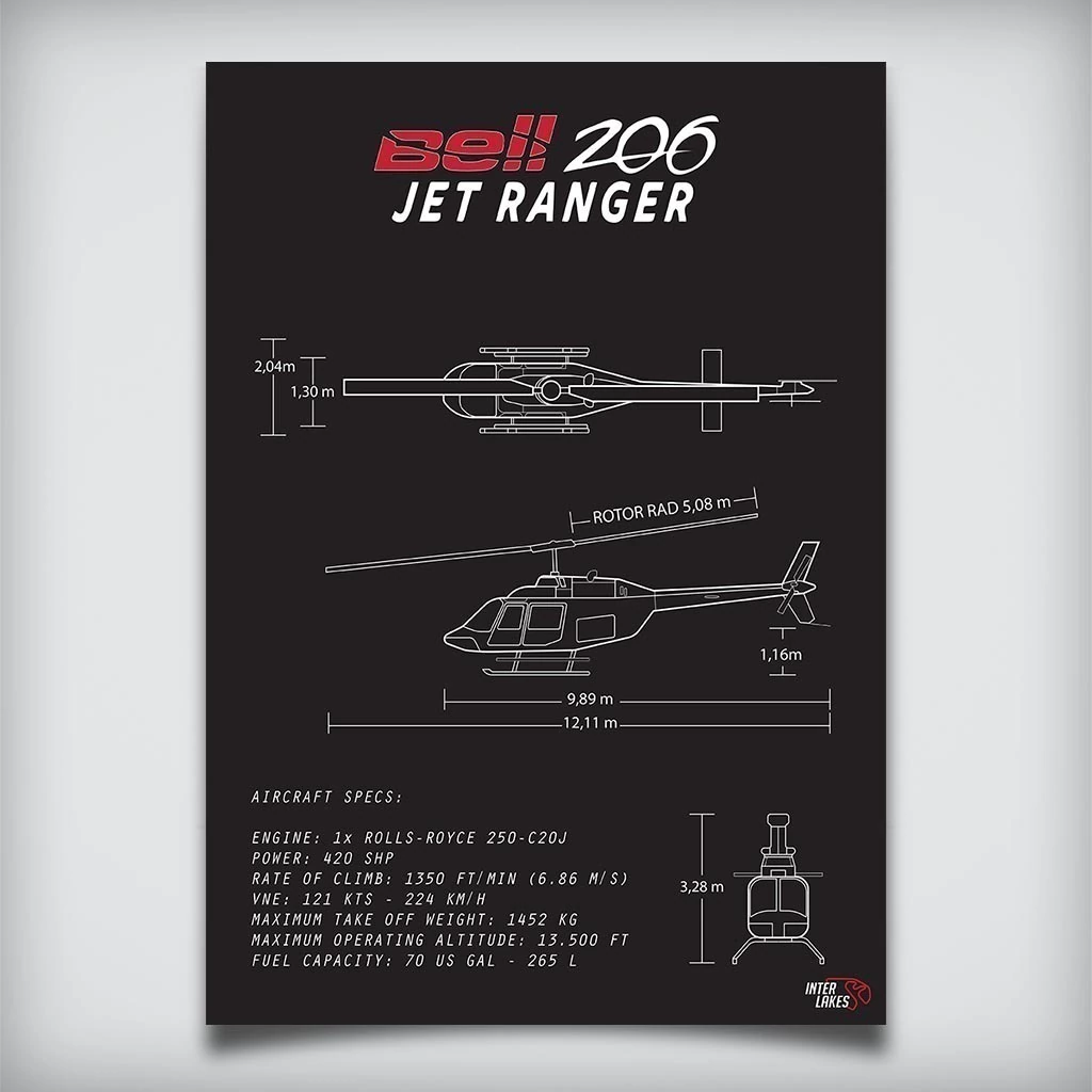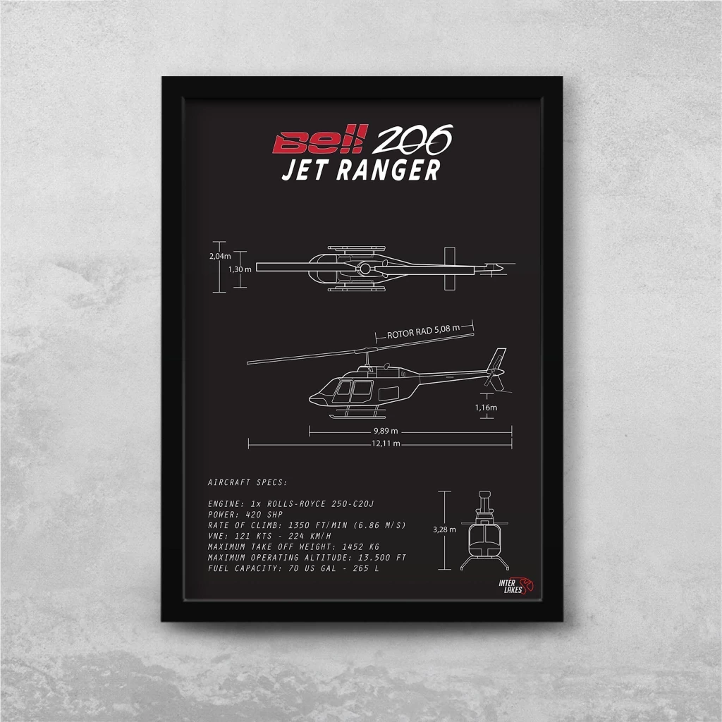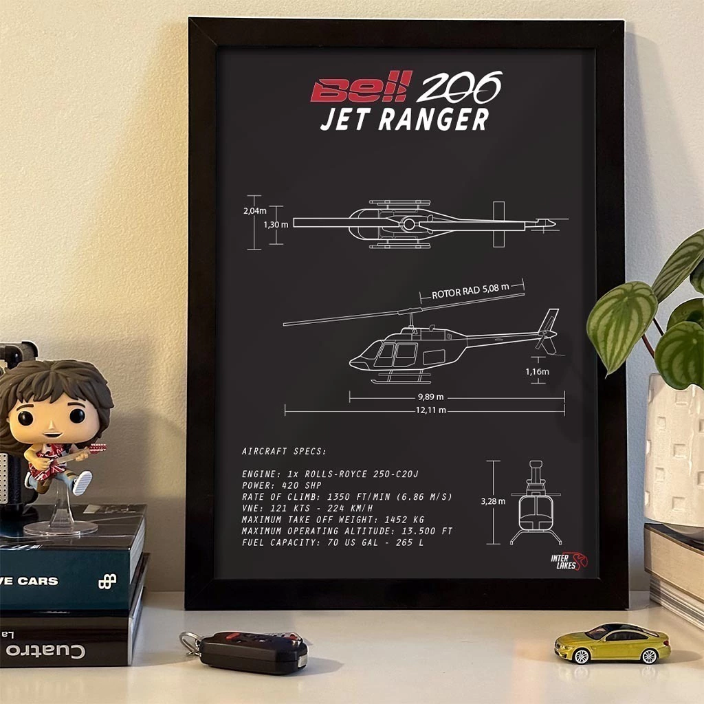 Traga o BELL 206 JET RANGER para fazer parte da decoração da sua casa, seja ele uma parte da sua história, esteja no hangar ou ainda exista apenas nos seus sonhos. Eternize a máquina que faz seu coração bater mais forte com um quadro decorativo exclusivo da Interlakes. Este quadro no ESTILO PRETO E BRANCO apresenta uma blueprint detalhada com as visões lateral, frontal e traseira (front view, side view, rear view), permitindo que você transforme seu lar em um verdadeiro templo para suas paixões aéreas. Adquira agora esta impressionante arte do BELL 206 JET RANGER e eleve o estilo do seu ambiente.