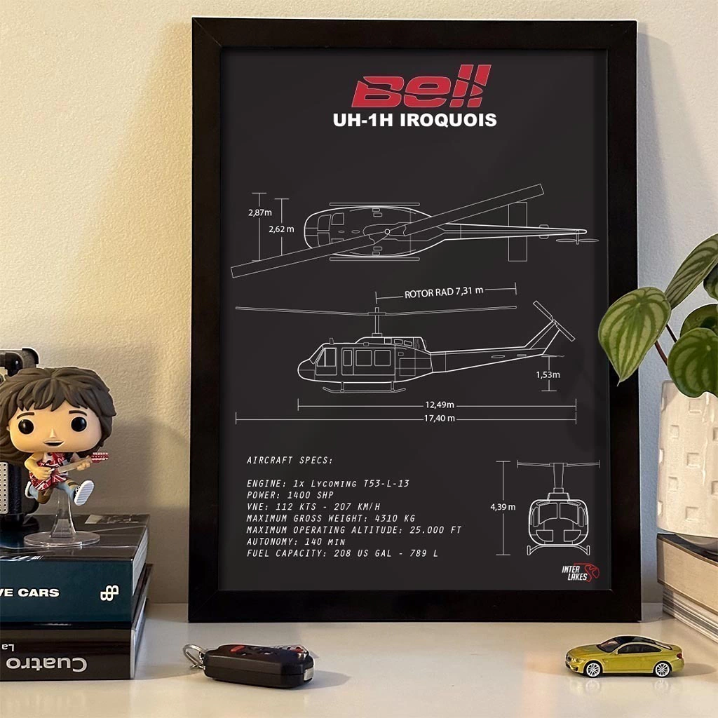Traga o BELL UH-1H para fazer parte da decoração da sua casa, seja ele uma parte da sua história, esteja no hangar ou ainda exista apenas nos seus sonhos. Eternize a máquina que faz seu coração bater mais forte com um quadro decorativo exclusivo da Interlakes. Este quadro no ESTILO PRETO E BRANCO apresenta uma blueprint detalhada com as visões lateral, frontal e traseira (front view, side view, rear view), permitindo que você transforme seu lar em um verdadeiro templo para suas paixões aéreas. Adquira agora esta impressionante arte do BELL UH-1H e eleve o estilo do seu ambiente.