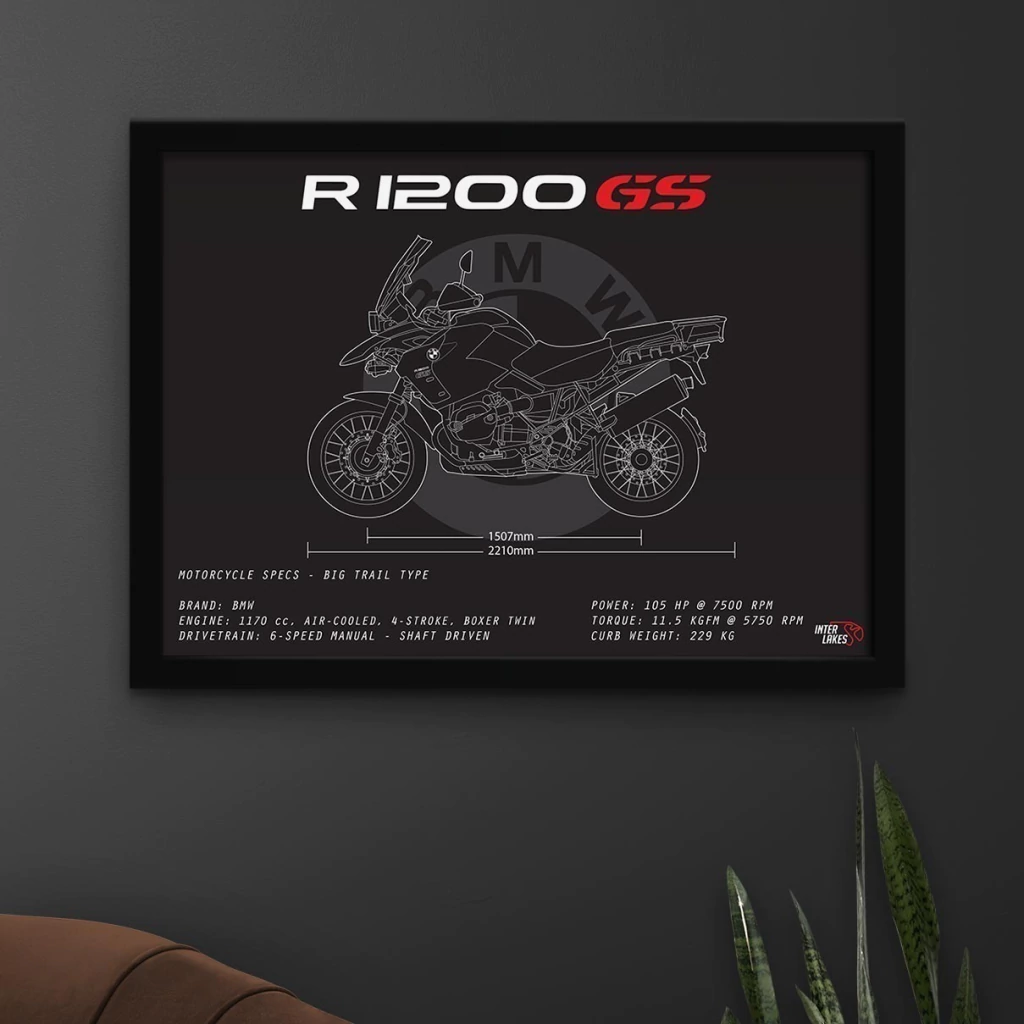 Traga o BMW R 1200 GS para fazer parte da decoração da sua casa, seja ele uma parte da sua história, esteja na sua garagem ou ainda exista apenas nos seus sonhos. Eternize a máquina que faz seu coração bater mais forte com um quadro decorativo exclusivo da Interlakes. Este quadro no ESTILO PRETO E BRANCO apresenta uma blueprint/desenho técnico detalhado com as visões lateral, frontal e traseira (front view, side view, rear view) com ficha técnica das especificações do veículo, permitindo que você transforme seu lar em um verdadeiro templo para suas paixões em duas rodas. Adquira agora esta impressionante arte do BMW R 1200 GS e eleve o estilo do seu ambiente.