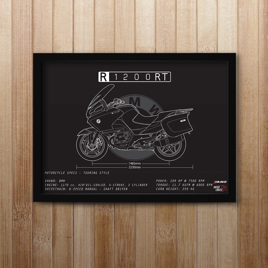 Traga o BMW R 1200 RT 2006 para fazer parte da decoração da sua casa, seja ele uma parte da sua história, esteja na sua garagem ou ainda exista apenas nos seus sonhos. Eternize a máquina que faz seu coração bater mais forte com um quadro decorativo exclusivo da Interlakes. Este quadro no ESTILO PRETO E BRANCO apresenta uma blueprint/desenho técnico detalhado com as visões lateral, frontal e traseira (front view, side view, rear view) com ficha técnica das especificações do veículo, permitindo que você transforme seu lar em um verdadeiro templo para suas paixões em duas rodas. Adquira agora esta impressionante arte do BMW R 1200 RT 2006 e eleve o estilo do seu ambiente.