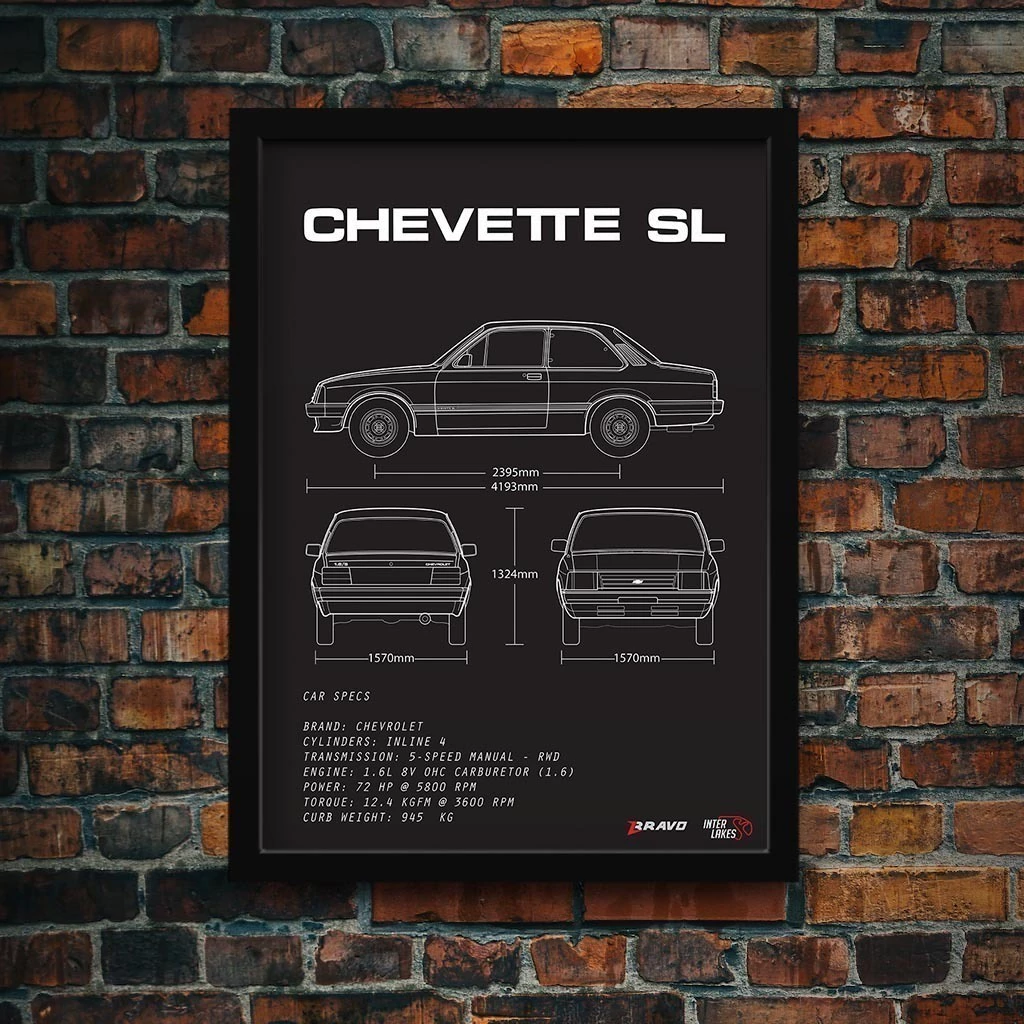 Traga o CHEVROLET CHEVETTE SL 1985 para fazer parte da decoração da sua casa, seja ele uma parte da sua história, esteja na garagem ou ainda exista apenas nos seus sonhos. Eternize a máquina que faz seu coração bater mais forte com um quadro decorativo exclusivo da Interlakes. Este quadro no ESTILO PRETO E BRANCO apresenta uma blueprint/desenho técnico detalhado com as visões lateral, frontal e traseira (front view, side view, rear view) com ficha técnica das especificações do veículo, permitindo que você transforme seu lar em um verdadeiro templo para suas paixões automotivas. Adquira agora esta impressionante arte do CHEVROLET CHEVETTE SL 1985 e eleve o estilo do seu ambiente.