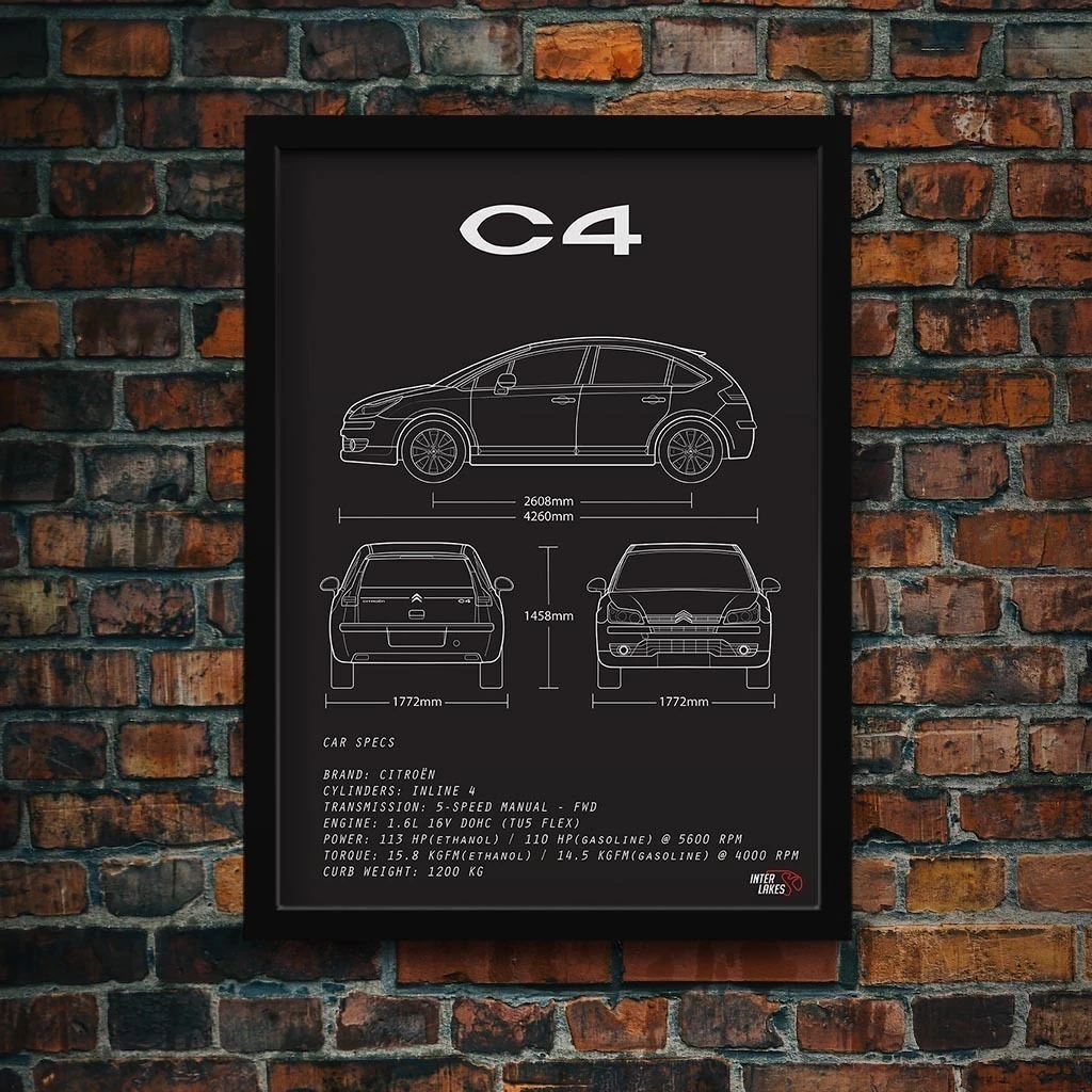 Traga o CITROEN C4 HATCH 1.6 para fazer parte da decoração da sua casa, seja ele uma parte da sua história, esteja na garagem ou ainda exista apenas nos seus sonhos. Eternize a máquina que faz seu coração bater mais forte com um quadro decorativo exclusivo da Interlakes. Este quadro no ESTILO PRETO E BRANCO apresenta uma blueprint/desenho técnico detalhado com as visões lateral, frontal e traseira (front view, side view, rear view) com ficha técnica das especificações do veículo, permitindo que você transforme seu lar em um verdadeiro templo para suas paixões automotivas. Adquira agora esta impressionante arte do CITROEN C4 HATCH 1.6 e eleve o estilo do seu ambiente.