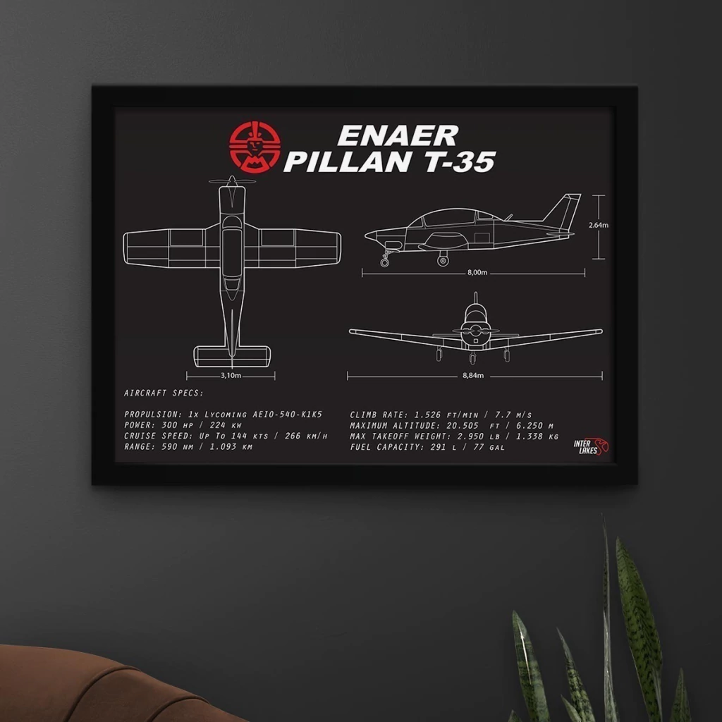 Traga o ENAER PILLAN T-35 para fazer parte da decoração da sua casa, seja ele uma parte da sua história, esteja no hangar ou ainda exista apenas nos seus sonhos. Eternize a máquina que faz seu coração bater mais forte com um quadro decorativo exclusivo da Interlakes. Este quadro no ESTILO PRETO E BRANCO apresenta uma blueprint detalhada com as visões lateral, frontal e traseira (front view, side view, rear view), permitindo que você transforme seu lar em um verdadeiro templo para suas paixões aéreas. Adquira agora esta impressionante arte do ENAER PILLAN T-35 e eleve o estilo do seu ambiente.