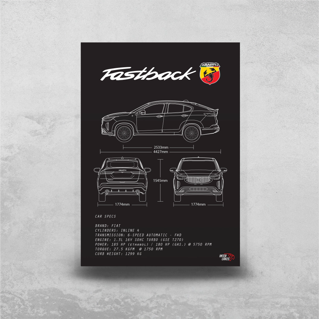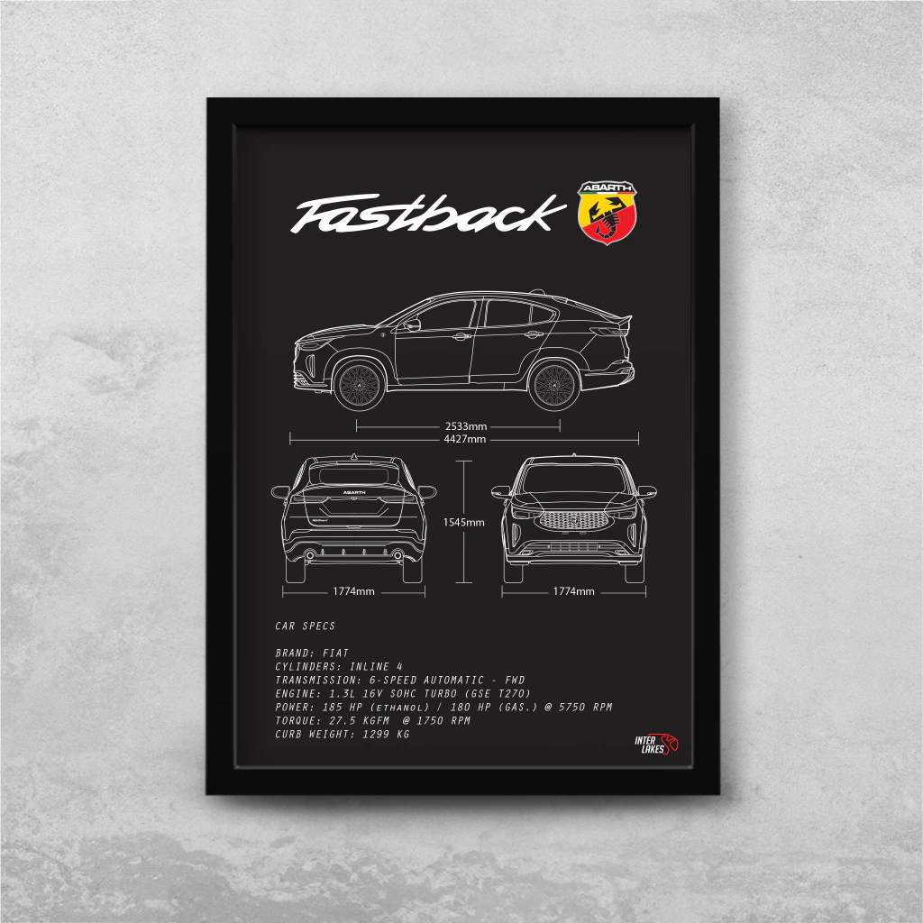 Traga o FIAT FASTBACK ABARTH para fazer parte da decoração da sua casa, seja ele uma parte da sua história, esteja na garagem ou ainda exista apenas nos seus sonhos. Eternize a máquina que faz seu coração bater mais forte com um quadro decorativo exclusivo da Interlakes. Este quadro no ESTILO PRETO E BRANCO apresenta uma blueprint/desenho técnico detalhado com as visões lateral, frontal e traseira (front view, side view, rear view) com ficha técnica das especificações do veículo, permitindo que você transforme seu lar em um verdadeiro templo para suas paixões automotivas. Adquira agora esta impressionante arte do FIAT FASTBACK ABARTH e eleve o estilo do seu ambiente.