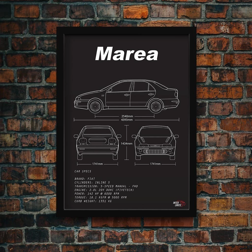 Traga o FIAT MAREA HLX 2.0 20V 1998 para fazer parte da decoração da sua casa, seja ele uma parte da sua história, esteja na garagem ou ainda exista apenas nos seus sonhos. Eternize a máquina que faz seu coração bater mais forte com um quadro decorativo exclusivo da Interlakes. Este quadro no ESTILO PRETO E BRANCO apresenta uma blueprint/desenho técnico detalhado com as visões lateral, frontal e traseira (front view, side view, rear view) com ficha técnica das especificações do veículo, permitindo que você transforme seu lar em um verdadeiro templo para suas paixões automotivas. Adquira agora esta impressionante arte do FIAT MAREA HLX 2.0 20V 1998 e eleve o estilo do seu ambiente.