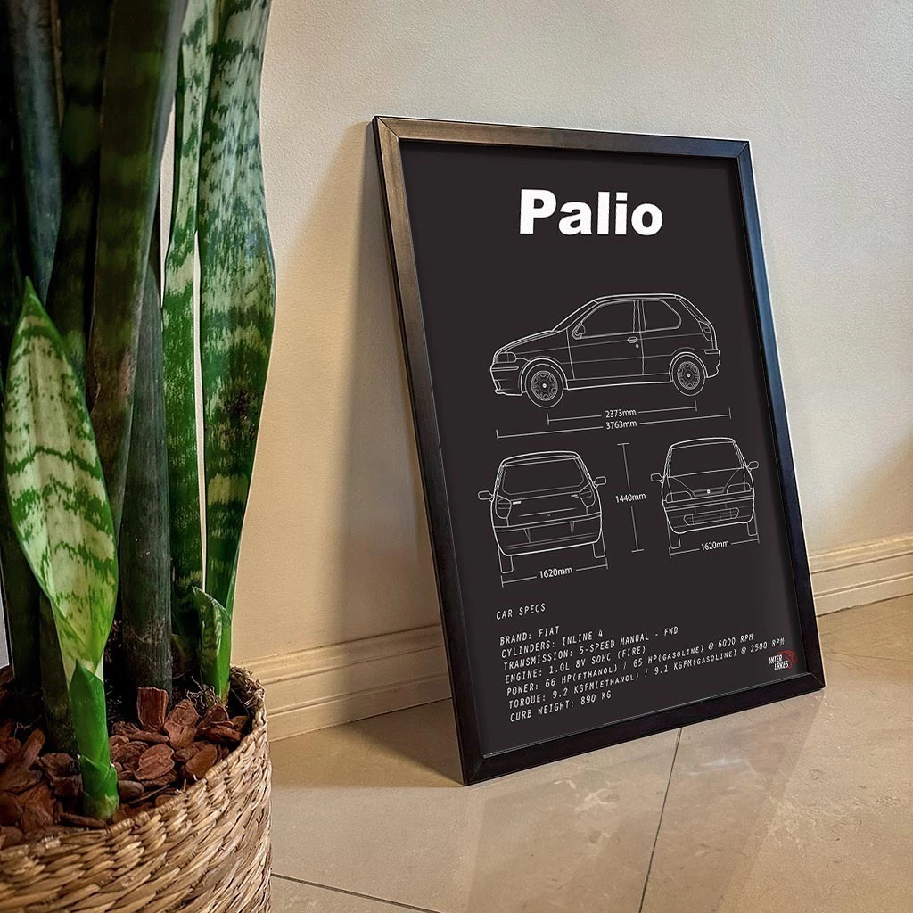 Traga o FIAT PALIO G2 1.0 2 PORTAS para fazer parte da decoração da sua casa, seja ele uma parte da sua história, esteja na garagem ou ainda exista apenas nos seus sonhos. Eternize a máquina que faz seu coração bater mais forte com um quadro decorativo exclusivo da Interlakes. Este quadro no ESTILO PRETO E BRANCO apresenta uma blueprint/desenho técnico detalhado com as visões lateral, frontal e traseira (front view, side view, rear view) com ficha técnica das especificações do veículo, permitindo que você transforme seu lar em um verdadeiro templo para suas paixões automotivas. Adquira agora esta impressionante arte do FIAT PALIO G2 1.0 2 PORTAS e eleve o estilo do seu ambiente.