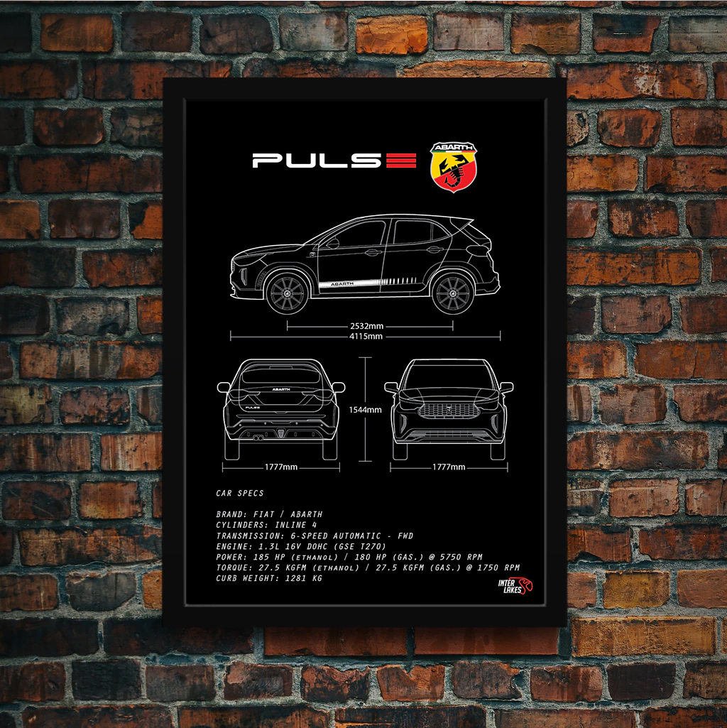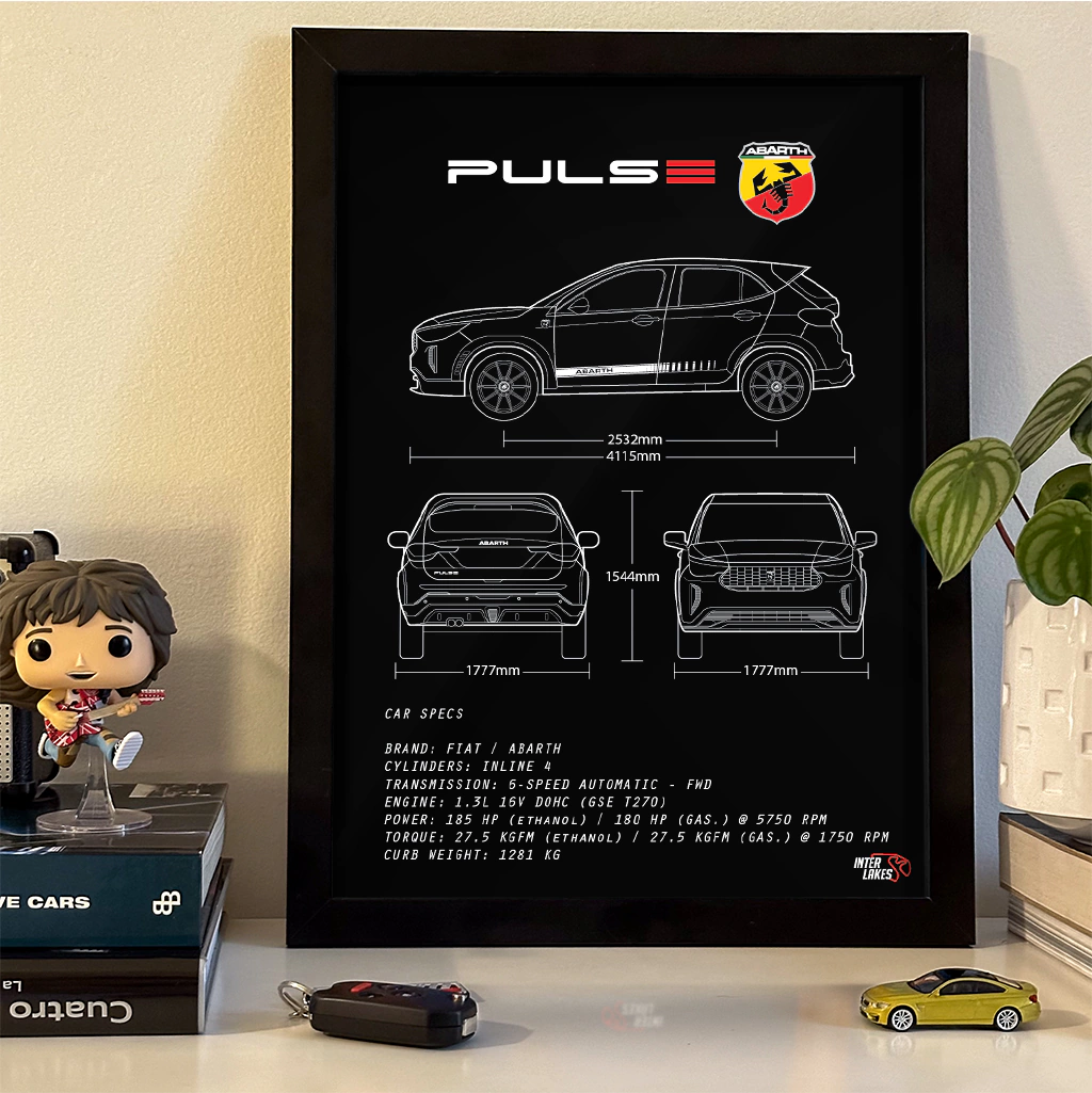 Traga o FIAT PULSE ABARTH 2022 para fazer parte da decoração da sua casa, seja ele uma parte da sua história, esteja na garagem ou ainda exista apenas nos seus sonhos. Eternize a máquina que faz seu coração bater mais forte com um quadro decorativo exclusivo da Interlakes. Este quadro no ESTILO PRETO E BRANCO apresenta uma blueprint/desenho técnico detalhado com as visões lateral, frontal e traseira (front view, side view, rear view) com ficha técnica das especificações do veículo, permitindo que você transforme seu lar em um verdadeiro templo para suas paixões automotivas. Adquira agora esta impressionante arte do FIAT PULSE ABARTH 2022 e eleve o estilo do seu ambiente.