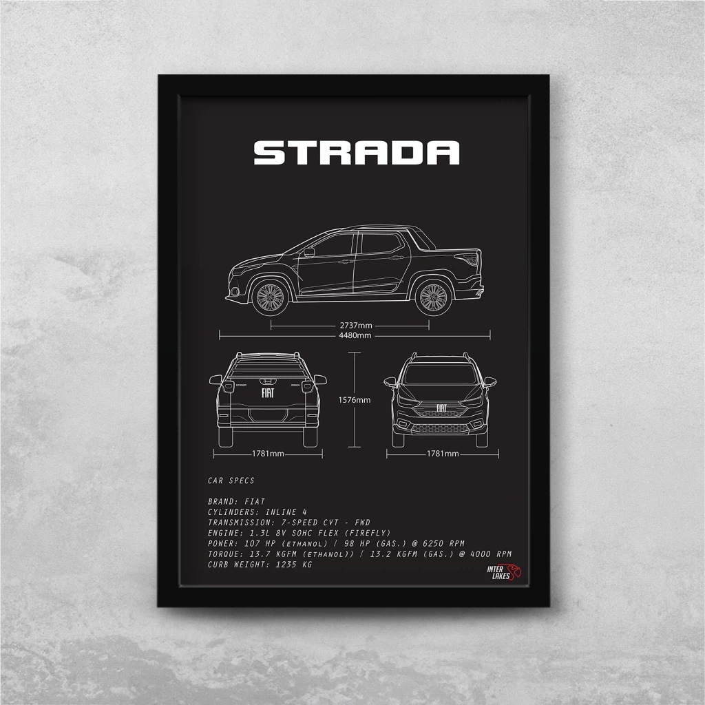 Traga o FIAT STRADA RANCH 2020 para fazer parte da decoração da sua casa, seja ele uma parte da sua história, esteja na garagem ou ainda exista apenas nos seus sonhos. Eternize a máquina que faz seu coração bater mais forte com um quadro decorativo exclusivo da Interlakes. Este quadro no ESTILO PRETO E BRANCO apresenta uma blueprint/desenho técnico detalhado com as visões lateral, frontal e traseira (front view, side view, rear view) com ficha técnica das especificações do veículo, permitindo que você transforme seu lar em um verdadeiro templo para suas paixões automotivas. Adquira agora esta impressionante arte do FIAT STRADA RANCH 2020 e eleve o estilo do seu ambiente.