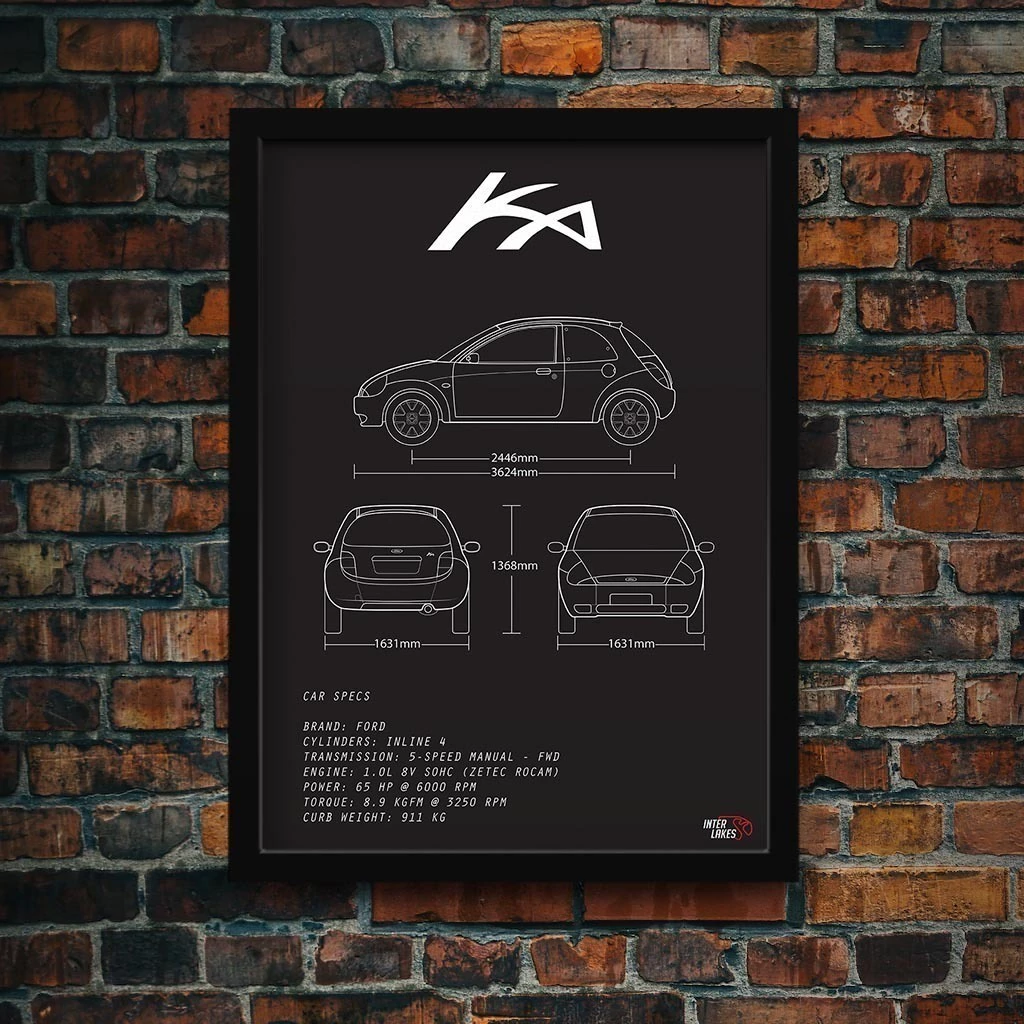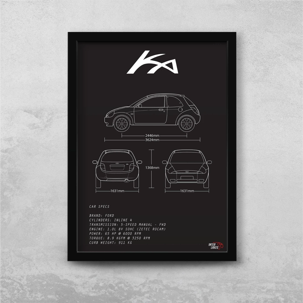 Traga o FORD KA 1.0 2007 para fazer parte da decoração da sua casa, seja ele uma parte da sua história, esteja na garagem ou ainda exista apenas nos seus sonhos. Eternize a máquina que faz seu coração bater mais forte com um quadro decorativo exclusivo da Interlakes. Este quadro no ESTILO PRETO E BRANCO apresenta uma blueprint/desenho técnico detalhado com as visões lateral, frontal e traseira (front view, side view, rear view) com ficha técnica das especificações do veículo, permitindo que você transforme seu lar em um verdadeiro templo para suas paixões automotivas. Adquira agora esta impressionante arte do FORD KA 1.0 2007 e eleve o estilo do seu ambiente.