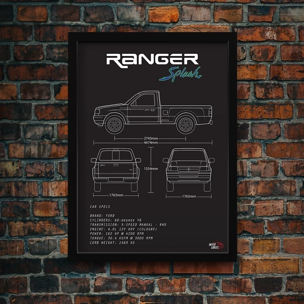 Traga o FORD RANGER SPLASH 1994 para fazer parte da decoração da sua casa, seja ele uma parte da sua história, esteja na garagem ou ainda exista apenas nos seus sonhos. Eternize a máquina que faz seu coração bater mais forte com um quadro decorativo exclusivo da Interlakes. Este quadro no ESTILO PRETO E BRANCO apresenta uma blueprint/desenho técnico detalhado com as visões lateral, frontal e traseira (front view, side view, rear view) com ficha técnica das especificações do veículo, permitindo que você transforme seu lar em um verdadeiro templo para suas paixões automotivas. Adquira agora esta impressionante arte do FORD RANGER SPLASH 1994 e eleve o estilo do seu ambiente.