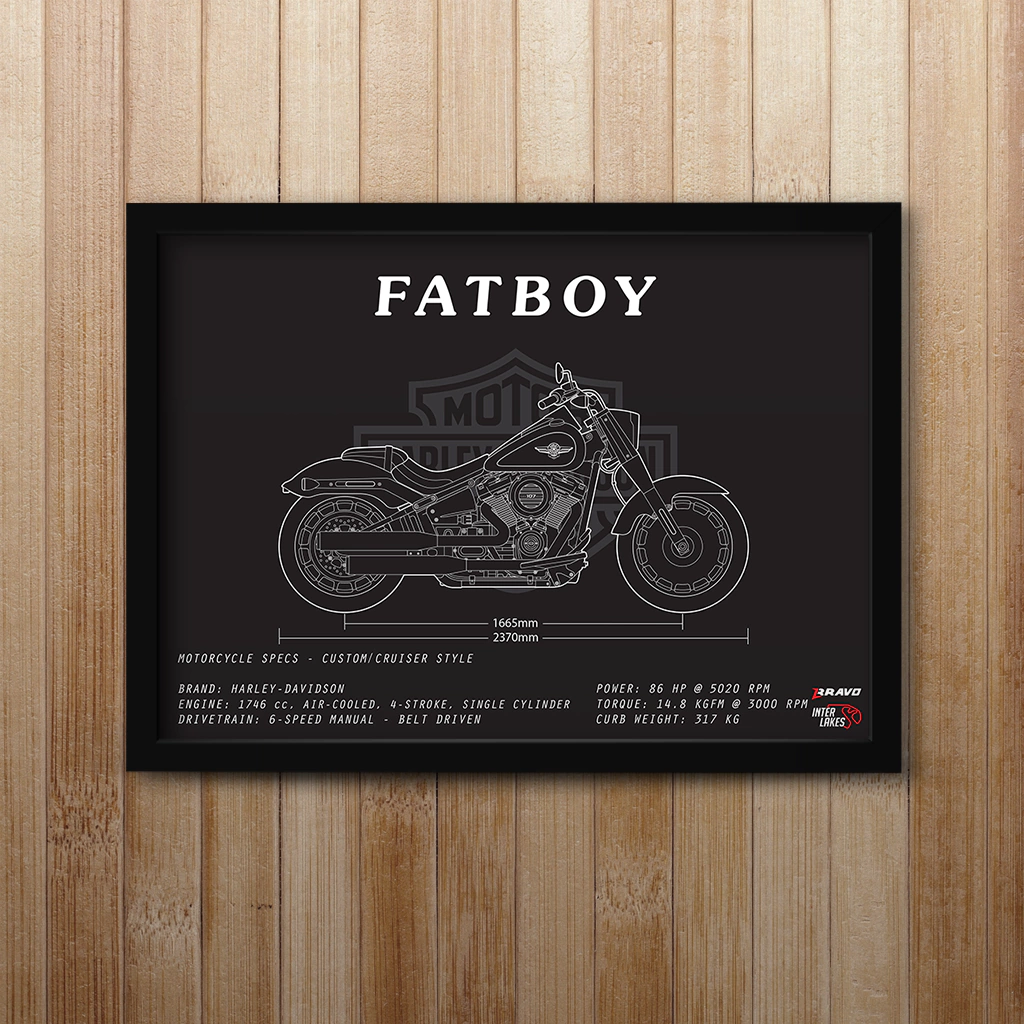 Traga o HARLEY-DAVIDSON FAT BOY 107 2020 para fazer parte da decoração da sua casa, seja ele uma parte da sua história, esteja na sua garagem ou ainda exista apenas nos seus sonhos. Eternize a máquina que faz seu coração bater mais forte com um quadro decorativo exclusivo da Interlakes. Este quadro no ESTILO PRETO E BRANCO apresenta uma blueprint/desenho técnico detalhado com as visões lateral, frontal e traseira (front view, side view, rear view) com ficha técnica das especificações do veículo, permitindo que você transforme seu lar em um verdadeiro templo para suas paixões em duas rodas. Adquira agora esta impressionante arte do HARLEY-DAVIDSON FAT BOY 107 2020 e eleve o estilo do seu ambiente.