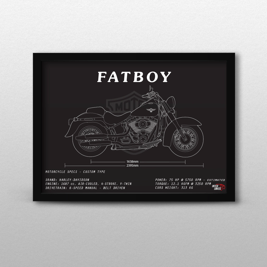 Traga o HARLEY-DAVIDSON FAT BOY SOFTAIL 2014 para fazer parte da decoração da sua casa, seja ele uma parte da sua história, esteja na sua garagem ou ainda exista apenas nos seus sonhos. Eternize a máquina que faz seu coração bater mais forte com um quadro decorativo exclusivo da Interlakes. Este quadro no ESTILO PRETO E BRANCO apresenta uma blueprint/desenho técnico detalhado com as visões lateral, frontal e traseira (front view, side view, rear view) com ficha técnica das especificações do veículo, permitindo que você transforme seu lar em um verdadeiro templo para suas paixões em duas rodas. Adquira agora esta impressionante arte do HARLEY-DAVIDSON FAT BOY SOFTAIL 2014 e eleve o estilo do seu ambiente.