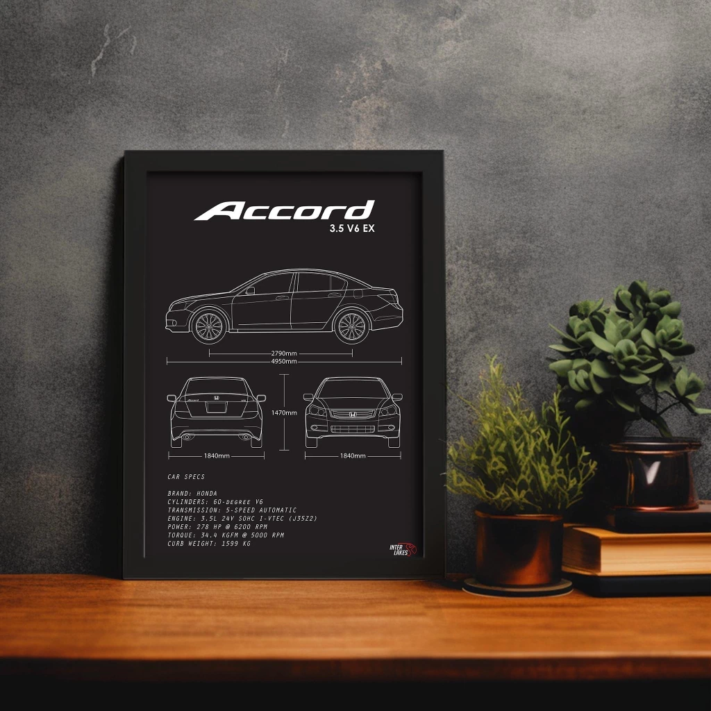 Traga o HONDA ACCORD 3.5 V6 EX 2008 para fazer parte da decoração da sua casa, seja ele uma parte da sua história, esteja na garagem ou ainda exista apenas nos seus sonhos. Eternize a máquina que faz seu coração bater mais forte com um quadro decorativo exclusivo da Interlakes. Este quadro no ESTILO PRETO E BRANCO apresenta uma blueprint/desenho técnico detalhado com as visões lateral, frontal e traseira (front view, side view, rear view) com ficha técnica das especificações do veículo, permitindo que você transforme seu lar em um verdadeiro templo para suas paixões automotivas. Adquira agora esta impressionante arte do HONDA ACCORD 3.5 V6 EX 2008 e eleve o estilo do seu ambiente.