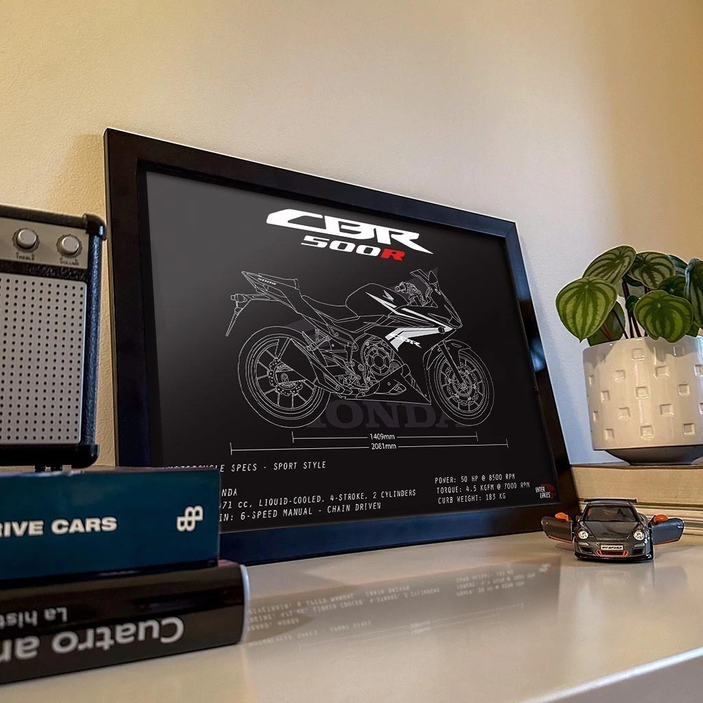 Traga o HONDA CBR 500R 2018 para fazer parte da decoração da sua casa, seja ele uma parte da sua história, esteja na sua garagem ou ainda exista apenas nos seus sonhos. Eternize a máquina que faz seu coração bater mais forte com um quadro decorativo exclusivo da Interlakes. Este quadro no ESTILO PRETO E BRANCO apresenta uma blueprint/desenho técnico detalhado com as visões lateral, frontal e traseira (front view, side view, rear view) com ficha técnica das especificações do veículo, permitindo que você transforme seu lar em um verdadeiro templo para suas paixões em duas rodas. Adquira agora esta impressionante arte do HONDA CBR 500R 2018 e eleve o estilo do seu ambiente.