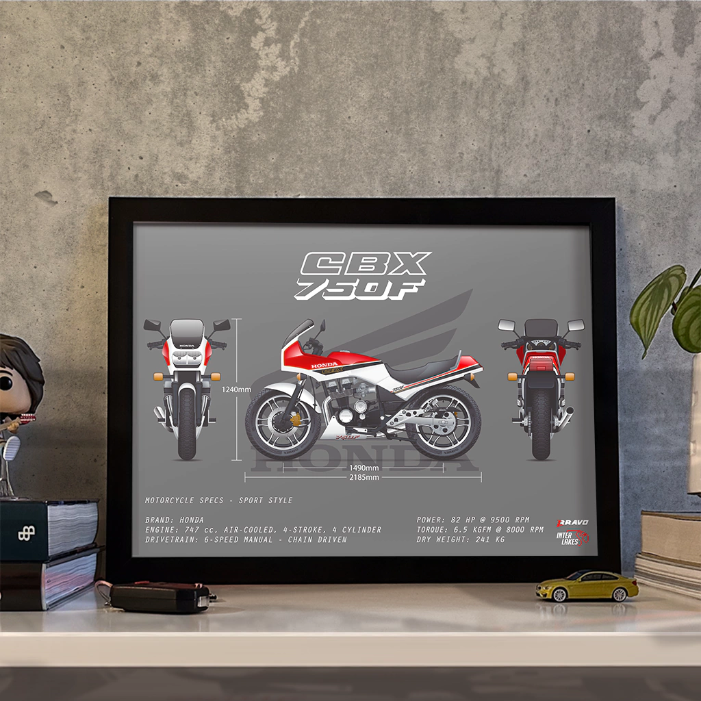 Traga o HONDA CBX 750F para fazer parte da decoração da sua casa, seja ele uma parte da sua história, esteja na sua garagem ou ainda exista apenas nos seus sonhos. Eternize a máquina que faz seu coração bater mais forte com um quadro decorativo exclusivo da Interlakes. Este quadro no ESTILO PRETO E BRANCO apresenta uma blueprint/desenho técnico detalhado com as visões lateral, frontal e traseira (front view, side view, rear view) com ficha técnica das especificações do veículo, permitindo que você transforme seu lar em um verdadeiro templo para suas paixões em duas rodas. Adquira agora esta impressionante arte do HONDA CBX 750F e eleve o estilo do seu ambiente.
