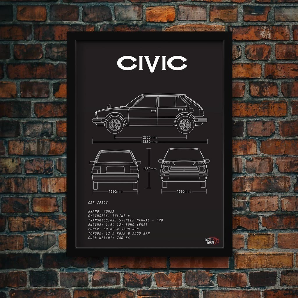 Traga o HONDA CIVIC 1.5 G2 1981 para fazer parte da decoração da sua casa, seja ele uma parte da sua história, esteja na garagem ou ainda exista apenas nos seus sonhos. Eternize a máquina que faz seu coração bater mais forte com um quadro decorativo exclusivo da Interlakes. Este quadro no ESTILO PRETO E BRANCO apresenta uma blueprint/desenho técnico detalhado com as visões lateral, frontal e traseira (front view, side view, rear view) com ficha técnica das especificações do veículo, permitindo que você transforme seu lar em um verdadeiro templo para suas paixões automotivas. Adquira agora esta impressionante arte do HONDA CIVIC 1.5 G2 1981 e eleve o estilo do seu ambiente.