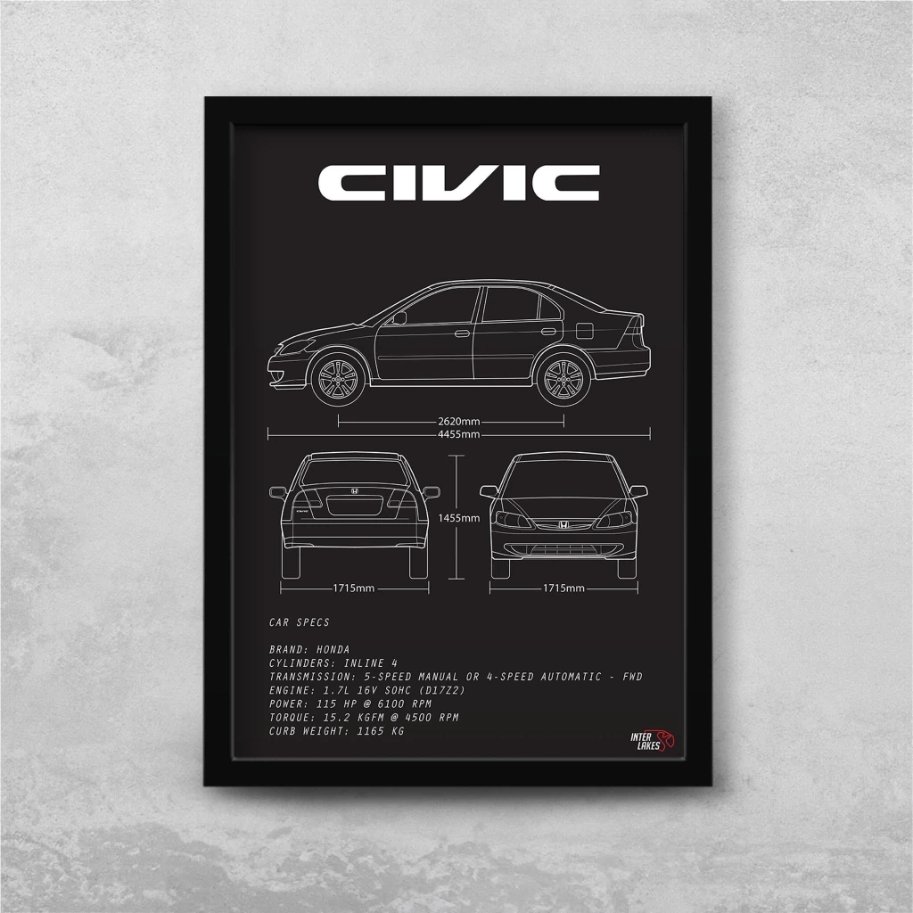 Traga o HONDA CIVIC LX G7 2003 para fazer parte da decoração da sua casa, seja ele uma parte da sua história, esteja na garagem ou ainda exista apenas nos seus sonhos. Eternize a máquina que faz seu coração bater mais forte com um quadro decorativo exclusivo da Interlakes. Este quadro no ESTILO PRETO E BRANCO apresenta uma blueprint/desenho técnico detalhado com as visões lateral, frontal e traseira (front view, side view, rear view) com ficha técnica das especificações do veículo, permitindo que você transforme seu lar em um verdadeiro templo para suas paixões automotivas. Adquira agora esta impressionante arte do HONDA CIVIC LX G7 2003 e eleve o estilo do seu ambiente.