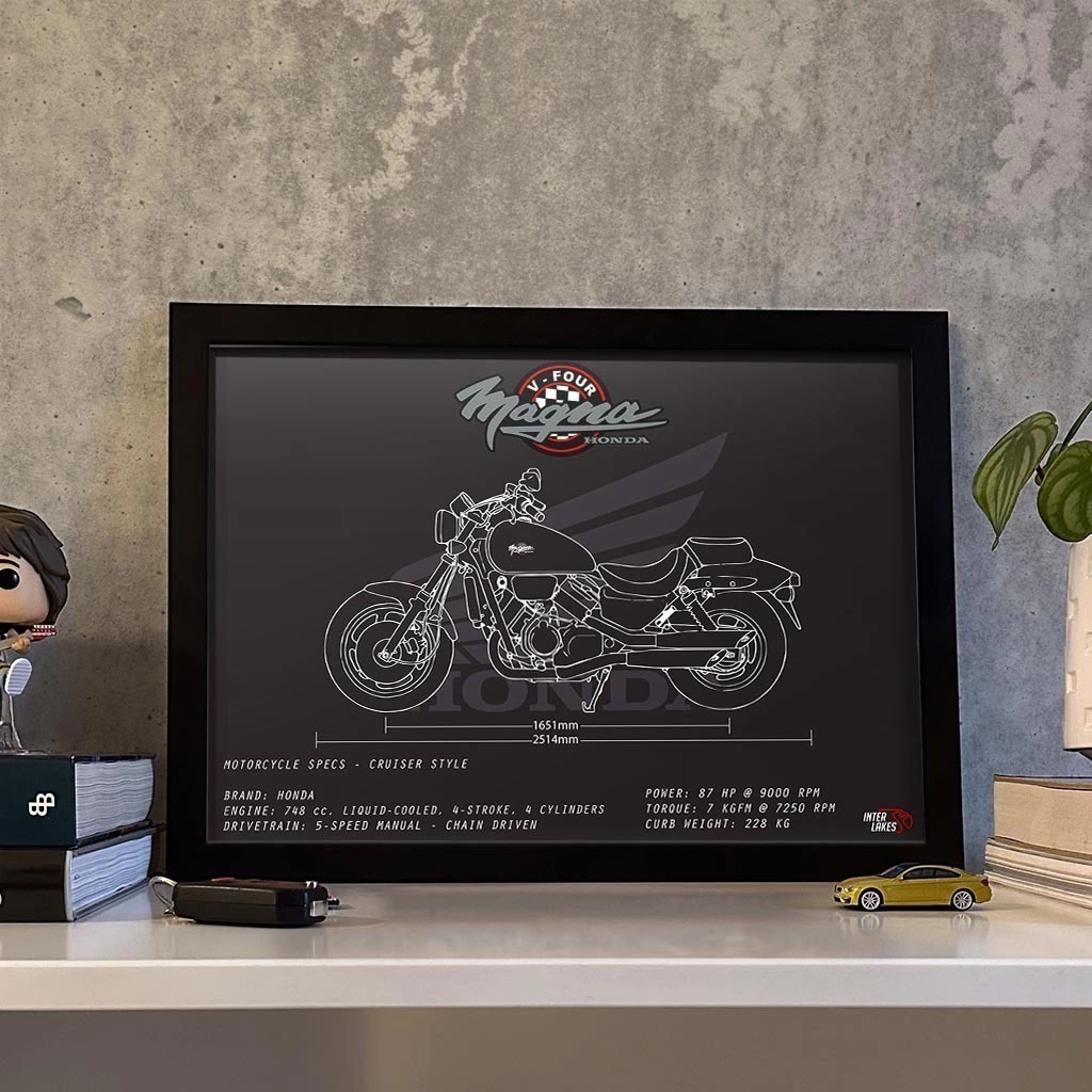 Traga o HONDA VF 750C MAGNA para fazer parte da decoração da sua casa, seja ele uma parte da sua história, esteja na sua garagem ou ainda exista apenas nos seus sonhos. Eternize a máquina que faz seu coração bater mais forte com um quadro decorativo exclusivo da Interlakes. Este quadro no ESTILO PRETO E BRANCO apresenta uma blueprint/desenho técnico detalhado com as visões lateral, frontal e traseira (front view, side view, rear view) com ficha técnica das especificações do veículo, permitindo que você transforme seu lar em um verdadeiro templo para suas paixões em duas rodas. Adquira agora esta impressionante arte do HONDA VF 750C MAGNA e eleve o estilo do seu ambiente.