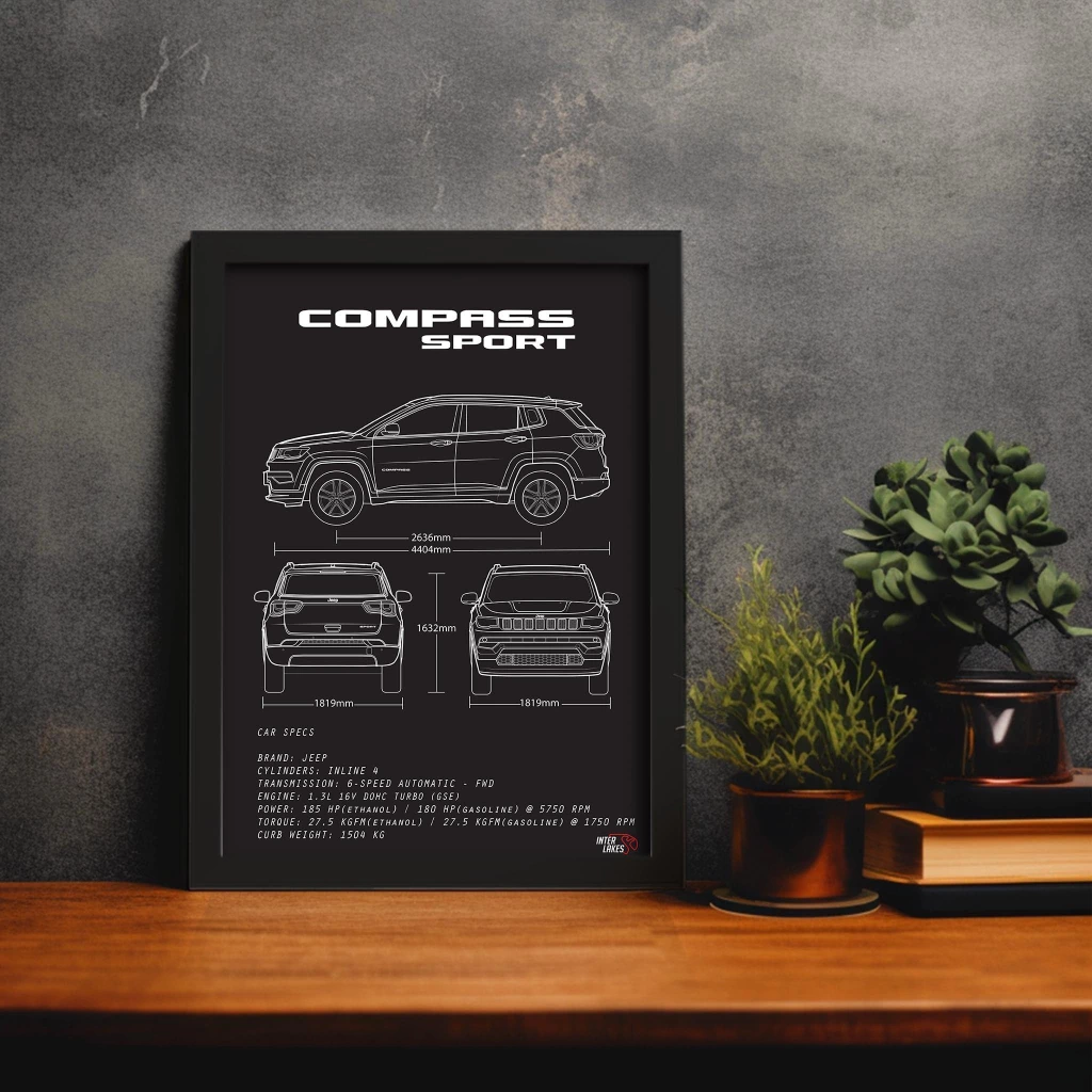 Traga o JEEP COMPASS SPORT 2022 para fazer parte da decoração da sua casa, seja ele uma parte da sua história, esteja na garagem ou ainda exista apenas nos seus sonhos. Eternize a máquina que faz seu coração bater mais forte com um quadro decorativo exclusivo da Interlakes. Este quadro no ESTILO PRETO E BRANCO apresenta uma blueprint/desenho técnico detalhado com as visões lateral, frontal e traseira (front view, side view, rear view) com ficha técnica das especificações do veículo, permitindo que você transforme seu lar em um verdadeiro templo para suas paixões automotivas. Adquira agora esta impressionante arte do JEEP COMPASS SPORT 2022 e eleve o estilo do seu ambiente.