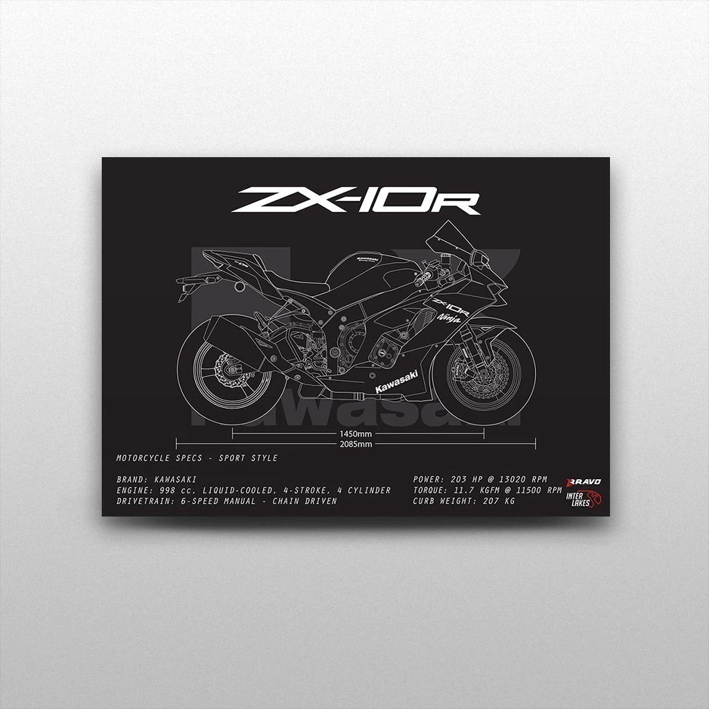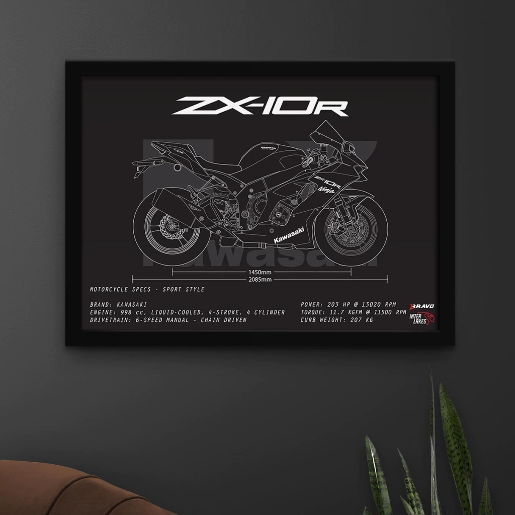Traga o KAWASAKI NINJA ZX-10 R 2022 para fazer parte da decoração da sua casa, seja ele uma parte da sua história, esteja na sua garagem ou ainda exista apenas nos seus sonhos. Eternize a máquina que faz seu coração bater mais forte com um quadro decorativo exclusivo da Interlakes. Este quadro no ESTILO PRETO E BRANCO apresenta uma blueprint/desenho técnico detalhado com as visões lateral, frontal e traseira (front view, side view, rear view) com ficha técnica das especificações do veículo, permitindo que você transforme seu lar em um verdadeiro templo para suas paixões em duas rodas. Adquira agora esta impressionante arte do KAWASAKI NINJA ZX-10 R 2022 e eleve o estilo do seu ambiente.