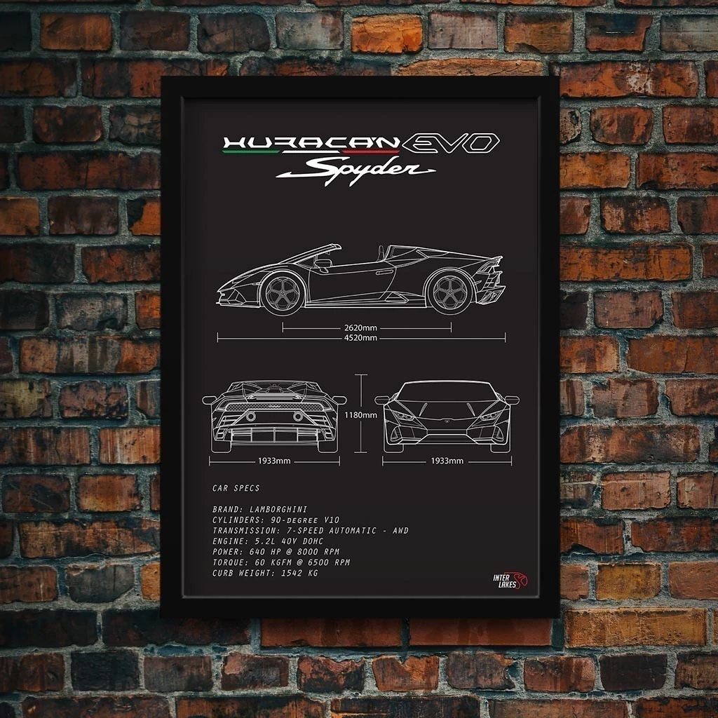 Traga o LAMBORGHINI HURACAN EVO SPYDER para fazer parte da decoração da sua casa, seja ele uma parte da sua história, esteja na garagem ou ainda exista apenas nos seus sonhos. Eternize a máquina que faz seu coração bater mais forte com um quadro decorativo exclusivo da Interlakes. Este quadro no ESTILO PRETO E BRANCO apresenta uma blueprint/desenho técnico detalhado com as visões lateral, frontal e traseira (front view, side view, rear view) com ficha técnica das especificações do veículo, permitindo que você transforme seu lar em um verdadeiro templo para suas paixões automotivas. Adquira agora esta impressionante arte do LAMBORGHINI HURACAN EVO SPYDER e eleve o estilo do seu ambiente.