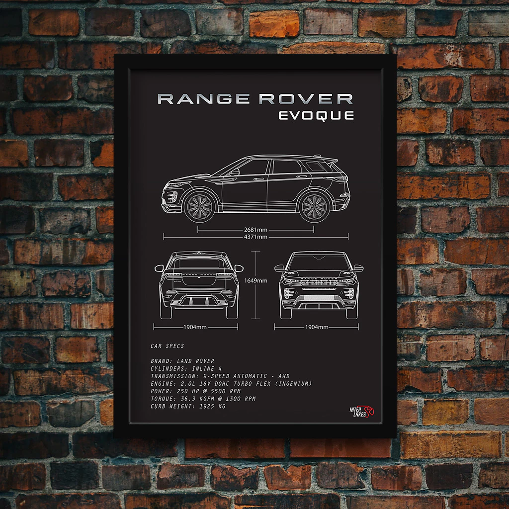 Traga o LAND ROVER EVOQUE DYNAMIC 2024 para fazer parte da decoração da sua casa, seja ele uma parte da sua história, esteja na garagem ou ainda exista apenas nos seus sonhos. Eternize a máquina que faz seu coração bater mais forte com um quadro decorativo exclusivo da Interlakes. Este quadro no ESTILO PRETO E BRANCO apresenta uma blueprint/desenho técnico detalhado com as visões lateral, frontal e traseira (front view, side view, rear view) com ficha técnica das especificações do veículo, permitindo que você transforme seu lar em um verdadeiro templo para suas paixões automotivas. Adquira agora esta impressionante arte do LAND ROVER EVOQUE DYNAMIC 2024 e eleve o estilo do seu ambiente.