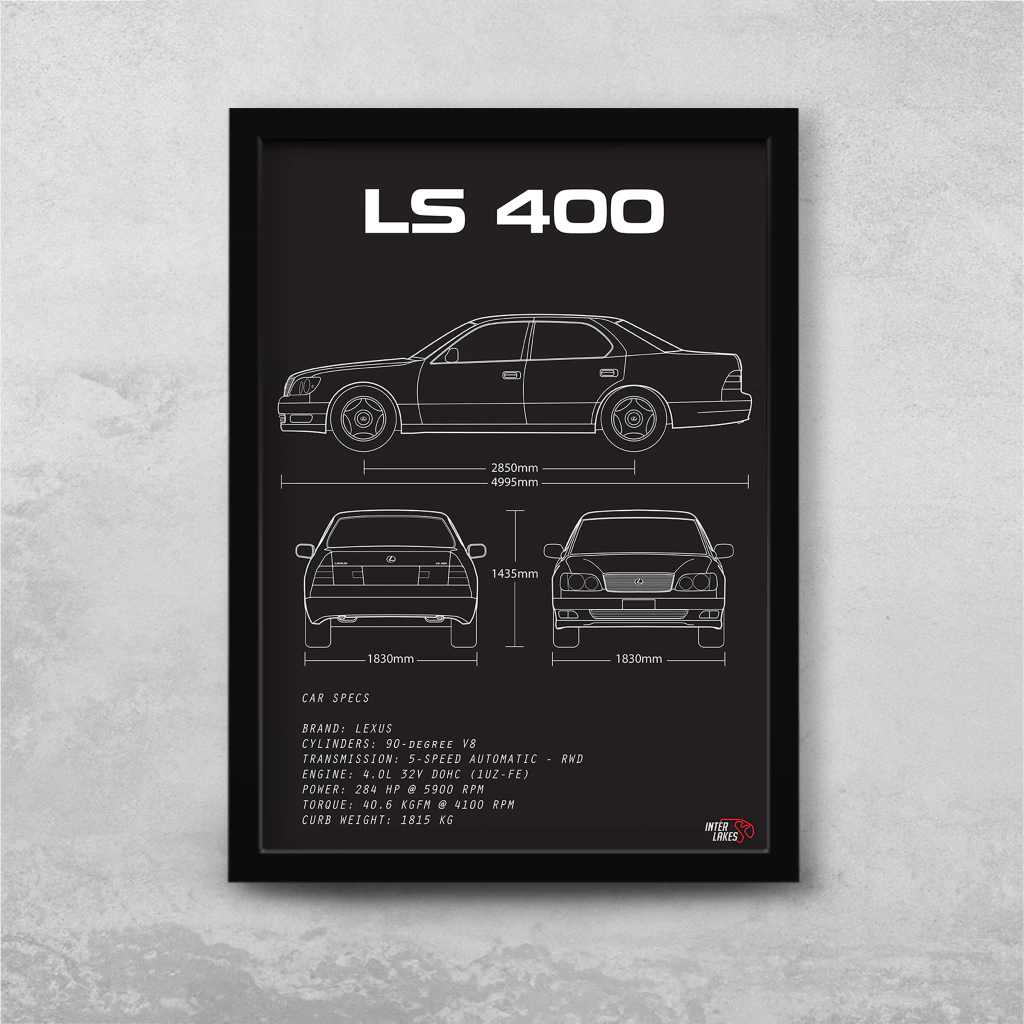 Traga o LEXUS LS400 1998 para fazer parte da decoração da sua casa, seja ele uma parte da sua história, esteja na garagem ou ainda exista apenas nos seus sonhos. Eternize a máquina que faz seu coração bater mais forte com um quadro decorativo exclusivo da Interlakes. Este quadro no ESTILO PRETO E BRANCO apresenta uma blueprint/desenho técnico detalhado com as visões lateral, frontal e traseira (front view, side view, rear view) com ficha técnica das especificações do veículo, permitindo que você transforme seu lar em um verdadeiro templo para suas paixões automotivas. Adquira agora esta impressionante arte do LEXUS LS400 1998 e eleve o estilo do seu ambiente.