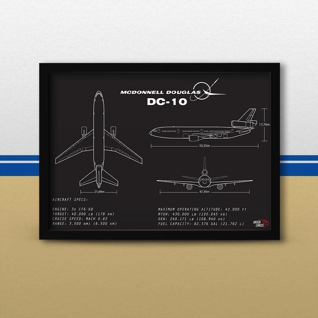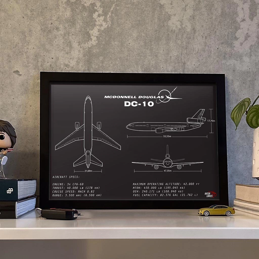 Traga o MCDONNELL DOUGLAS DC-10 para fazer parte da decoração da sua casa, seja ele uma parte da sua história, esteja no hangar ou ainda exista apenas nos seus sonhos. Eternize a máquina que faz seu coração bater mais forte com um quadro decorativo exclusivo da Interlakes. Este quadro no ESTILO PRETO E BRANCO apresenta uma blueprint detalhada com as visões lateral, frontal e traseira (front view, side view, rear view), permitindo que você transforme seu lar em um verdadeiro templo para suas paixões aéreas. Adquira agora esta impressionante arte do MCDONNELL DOUGLAS DC-10 e eleve o estilo do seu ambiente.