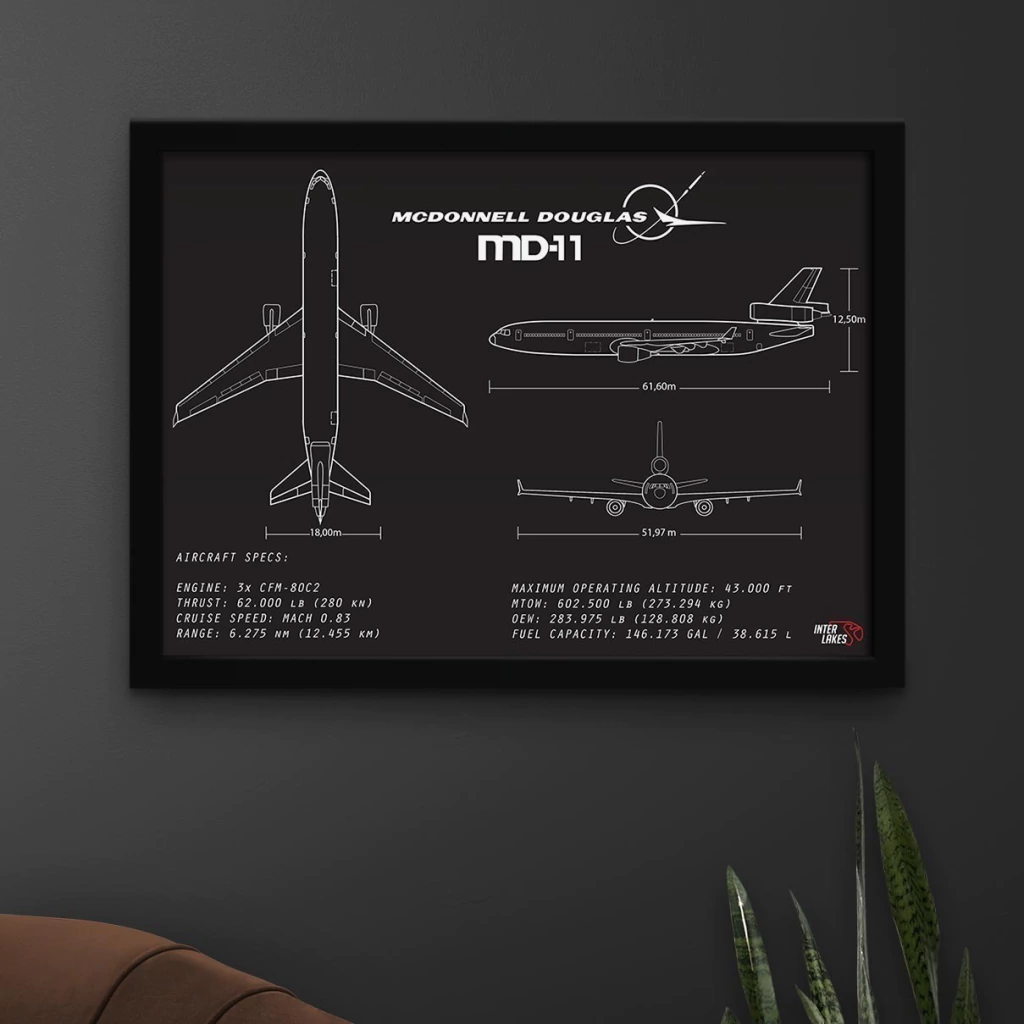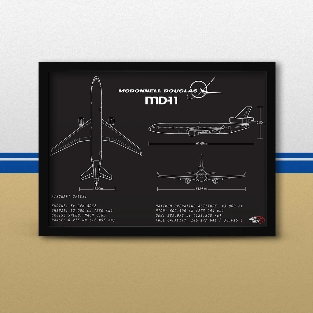 Traga o MCDONNELL DOUGLAS MD-11 para fazer parte da decoração da sua casa, seja ele uma parte da sua história, esteja no hangar ou ainda exista apenas nos seus sonhos. Eternize a máquina que faz seu coração bater mais forte com um quadro decorativo exclusivo da Interlakes. Este quadro no ESTILO PRETO E BRANCO apresenta uma blueprint detalhada com as visões lateral, frontal e traseira (front view, side view, rear view), permitindo que você transforme seu lar em um verdadeiro templo para suas paixões aéreas. Adquira agora esta impressionante arte do MCDONNELL DOUGLAS MD-11 e eleve o estilo do seu ambiente.