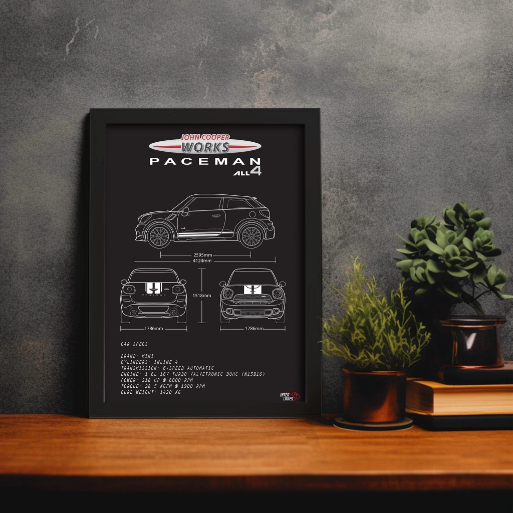 Traga o MINI COOPER PACEMAN JCW ALL4 R61 2014 para fazer parte da decoração da sua casa, seja ele uma parte da sua história, esteja na garagem ou ainda exista apenas nos seus sonhos. Eternize a máquina que faz seu coração bater mais forte com um quadro decorativo exclusivo da Interlakes. Este quadro no ESTILO PRETO E BRANCO apresenta uma blueprint/desenho técnico detalhado com as visões lateral, frontal e traseira (front view, side view, rear view) com ficha técnica das especificações do veículo, permitindo que você transforme seu lar em um verdadeiro templo para suas paixões automotivas. Adquira agora esta impressionante arte do MINI COOPER PACEMAN JCW ALL4 R61 2014 e eleve o estilo do seu ambiente.