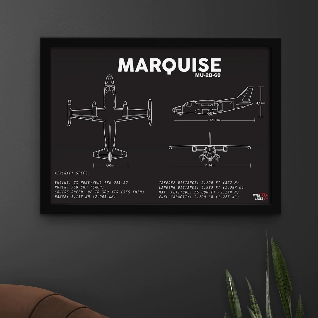 Traga o MITSUBISHI MARQUISE MU-2B-60 para fazer parte da decoração da sua casa, seja ele uma parte da sua história, esteja no hangar ou ainda exista apenas nos seus sonhos. Eternize a máquina que faz seu coração bater mais forte com um quadro decorativo exclusivo da Interlakes. Este quadro no ESTILO PRETO E BRANCO apresenta uma blueprint detalhada com as visões lateral, frontal e traseira (front view, side view, rear view), permitindo que você transforme seu lar em um verdadeiro templo para suas paixões aéreas. Adquira agora esta impressionante arte do MITSUBISHI MARQUISE MU-2B-60 e eleve o estilo do seu ambiente.