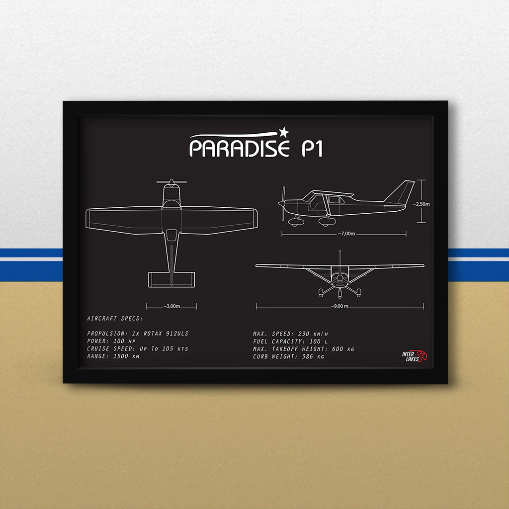 Traga o PARADISE P1 para fazer parte da decoração da sua casa, seja ele uma parte da sua história, esteja no hangar ou ainda exista apenas nos seus sonhos. Eternize a máquina que faz seu coração bater mais forte com um quadro decorativo exclusivo da Interlakes. Este quadro no ESTILO PRETO E BRANCO apresenta uma blueprint detalhada com as visões lateral, frontal e traseira (front view, side view, rear view), permitindo que você transforme seu lar em um verdadeiro templo para suas paixões aéreas. Adquira agora esta impressionante arte do PARADISE P1 e eleve o estilo do seu ambiente.