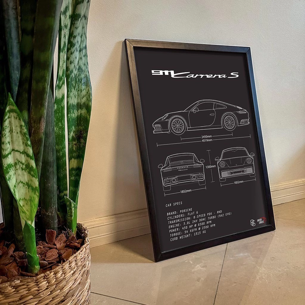 Traga o PORSCHE 911 CARRERA S 992 para fazer parte da decoração da sua casa, seja ele uma parte da sua história, esteja na garagem ou ainda exista apenas nos seus sonhos. Eternize a máquina que faz seu coração bater mais forte com um quadro decorativo exclusivo da Interlakes. Este quadro no ESTILO PRETO E BRANCO apresenta uma blueprint/desenho técnico detalhado com as visões lateral, frontal e traseira (front view, side view, rear view) com ficha técnica das especificações do veículo, permitindo que você transforme seu lar em um verdadeiro templo para suas paixões automotivas. Adquira agora esta impressionante arte do PORSCHE 911 CARRERA S 992 e eleve o estilo do seu ambiente.