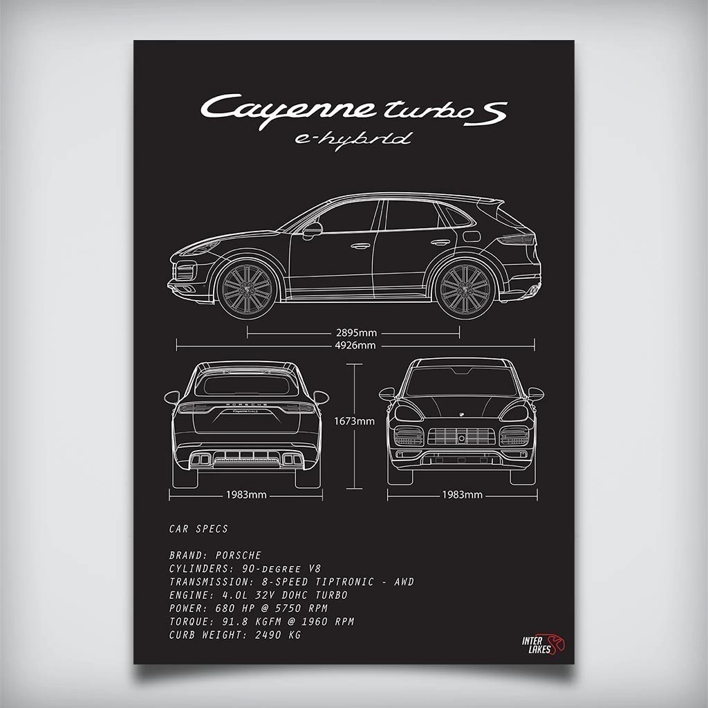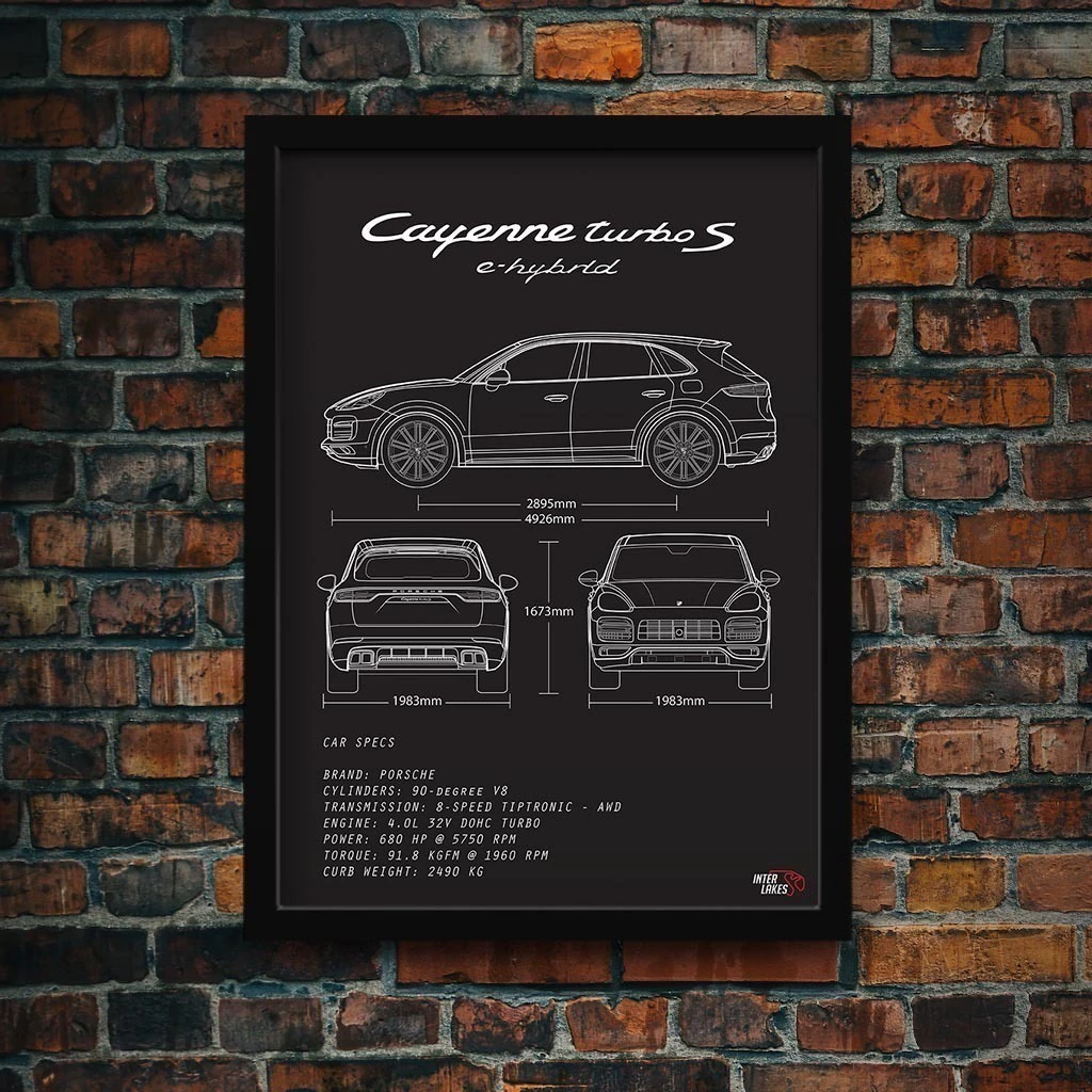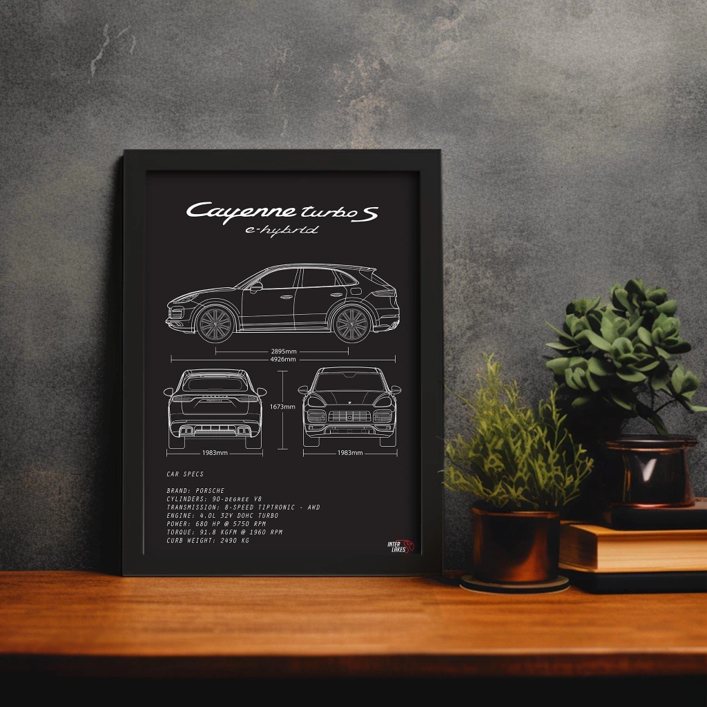Traga o PORSCHE CAYENNE TURBO HYBRID 2020 para fazer parte da decoração da sua casa, seja ele uma parte da sua história, esteja na garagem ou ainda exista apenas nos seus sonhos. Eternize a máquina que faz seu coração bater mais forte com um quadro decorativo exclusivo da Interlakes. Este quadro no ESTILO PRETO E BRANCO apresenta uma blueprint/desenho técnico detalhado com as visões lateral, frontal e traseira (front view, side view, rear view) com ficha técnica das especificações do veículo, permitindo que você transforme seu lar em um verdadeiro templo para suas paixões automotivas. Adquira agora esta impressionante arte do PORSCHE CAYENNE TURBO HYBRID 2020 e eleve o estilo do seu ambiente.