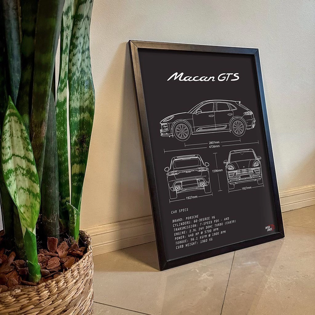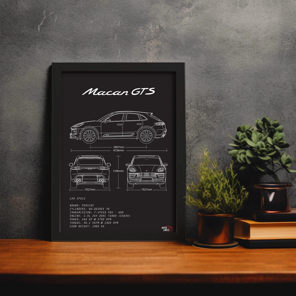 Traga o PORSCHE MACAN GTS 2022 para fazer parte da decoração da sua casa, seja ele uma parte da sua história, esteja na garagem ou ainda exista apenas nos seus sonhos. Eternize a máquina que faz seu coração bater mais forte com um quadro decorativo exclusivo da Interlakes. Este quadro no ESTILO PRETO E BRANCO apresenta uma blueprint/desenho técnico detalhado com as visões lateral, frontal e traseira (front view, side view, rear view) com ficha técnica das especificações do veículo, permitindo que você transforme seu lar em um verdadeiro templo para suas paixões automotivas. Adquira agora esta impressionante arte do PORSCHE MACAN GTS 2022 e eleve o estilo do seu ambiente.