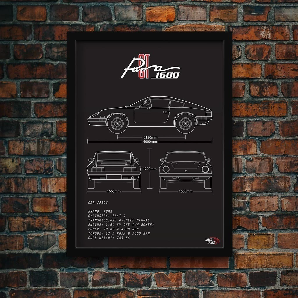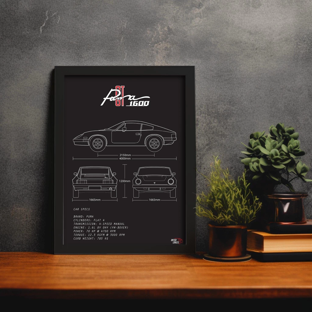 Traga o PUMA GTI para fazer parte da decoração da sua casa, seja ele uma parte da sua história, esteja na garagem ou ainda exista apenas nos seus sonhos. Eternize a máquina que faz seu coração bater mais forte com um quadro decorativo exclusivo da Interlakes. Este quadro no ESTILO PRETO E BRANCO apresenta uma blueprint/desenho técnico detalhado com as visões lateral, frontal e traseira (front view, side view, rear view) com ficha técnica das especificações do veículo, permitindo que você transforme seu lar em um verdadeiro templo para suas paixões automotivas. Adquira agora esta impressionante arte do PUMA GTI e eleve o estilo do seu ambiente.