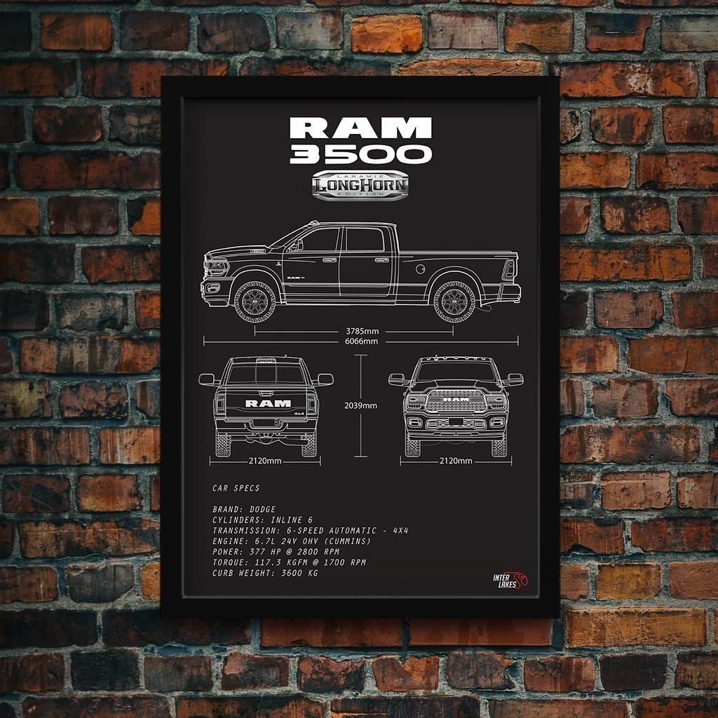 Traga o RAM 3500 LARAMIE LONGHORN 2022 para fazer parte da decoração da sua casa, seja ele uma parte da sua história, esteja na garagem ou ainda exista apenas nos seus sonhos. Eternize a máquina que faz seu coração bater mais forte com um quadro decorativo exclusivo da Interlakes. Este quadro no ESTILO PRETO E BRANCO apresenta uma blueprint/desenho técnico detalhado com as visões lateral, frontal e traseira (front view, side view, rear view) com ficha técnica das especificações do veículo, permitindo que você transforme seu lar em um verdadeiro templo para suas paixões automotivas. Adquira agora esta impressionante arte do RAM 3500 LARAMIE LONGHORN 2022 e eleve o estilo do seu ambiente.