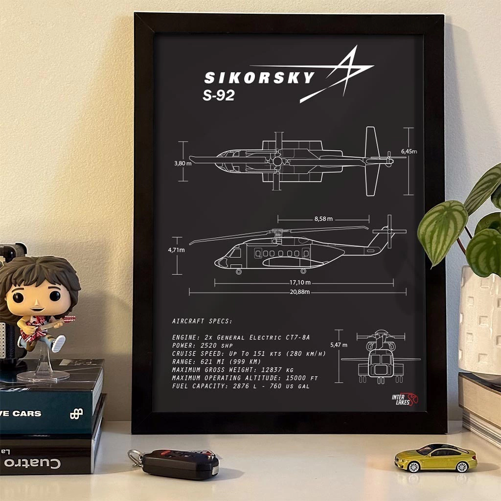 Traga o SIKORSKY S-92 para fazer parte da decoração da sua casa, seja ele uma parte da sua história, esteja no hangar ou ainda exista apenas nos seus sonhos. Eternize a máquina que faz seu coração bater mais forte com um quadro decorativo exclusivo da Interlakes. Este quadro no ESTILO PRETO E BRANCO apresenta uma blueprint detalhada com as visões lateral, frontal e traseira (front view, side view, rear view), permitindo que você transforme seu lar em um verdadeiro templo para suas paixões aéreas. Adquira agora esta impressionante arte do SIKORSKY S-92 e eleve o estilo do seu ambiente.