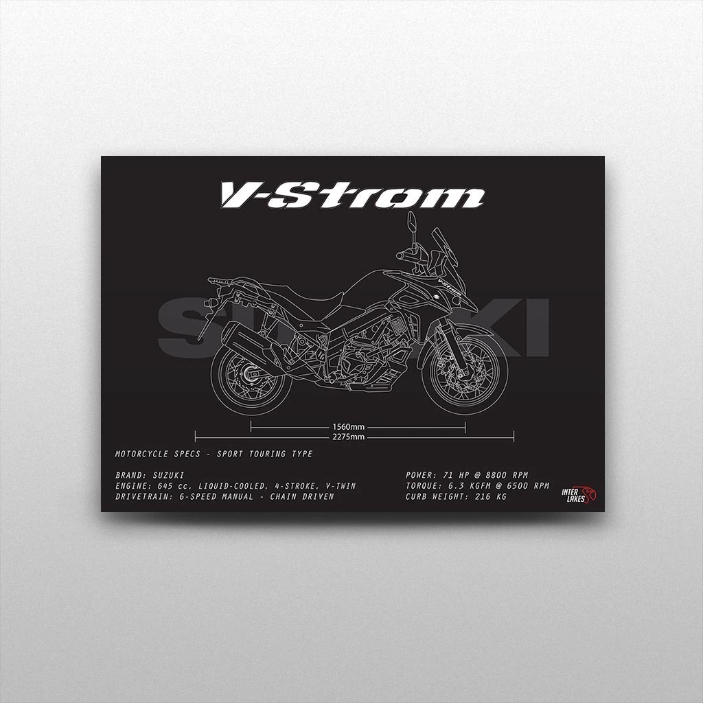 Traga o SUZUKI DL V-STROM 650XT 2021 para fazer parte da decoração da sua casa, seja ele uma parte da sua história, esteja na sua garagem ou ainda exista apenas nos seus sonhos. Eternize a máquina que faz seu coração bater mais forte com um quadro decorativo exclusivo da Interlakes. Este quadro no ESTILO PRETO E BRANCO apresenta uma blueprint/desenho técnico detalhado com as visões lateral, frontal e traseira (front view, side view, rear view) com ficha técnica das especificações do veículo, permitindo que você transforme seu lar em um verdadeiro templo para suas paixões em duas rodas. Adquira agora esta impressionante arte do SUZUKI DL V-STROM 650XT 2021 e eleve o estilo do seu ambiente.