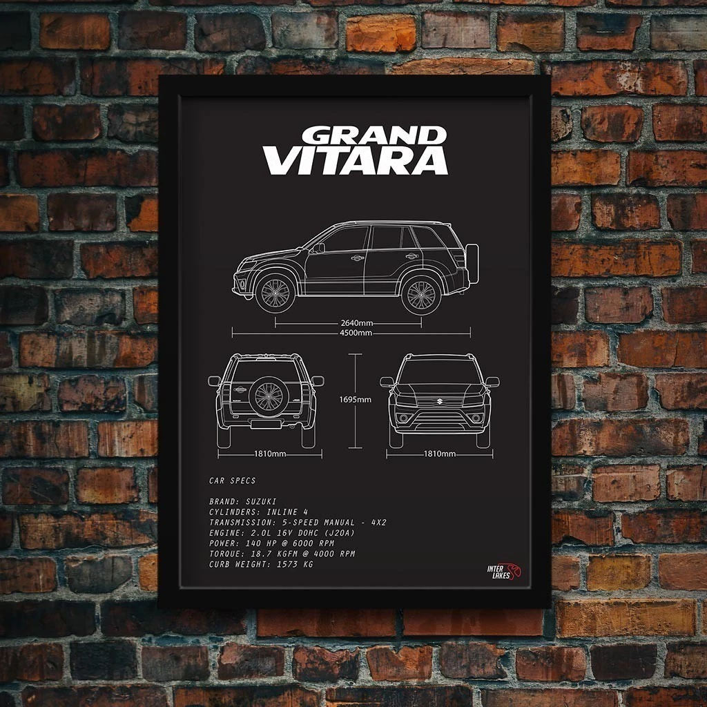 Traga o SUZUKI GRAND VITARA 2014 para fazer parte da decoração da sua casa, seja ele uma parte da sua história, esteja na garagem ou ainda exista apenas nos seus sonhos. Eternize a máquina que faz seu coração bater mais forte com um quadro decorativo exclusivo da Interlakes. Este quadro no ESTILO PRETO E BRANCO apresenta uma blueprint/desenho técnico detalhado com as visões lateral, frontal e traseira (front view, side view, rear view) com ficha técnica das especificações do veículo, permitindo que você transforme seu lar em um verdadeiro templo para suas paixões automotivas. Adquira agora esta impressionante arte do SUZUKI GRAND VITARA 2014 e eleve o estilo do seu ambiente.