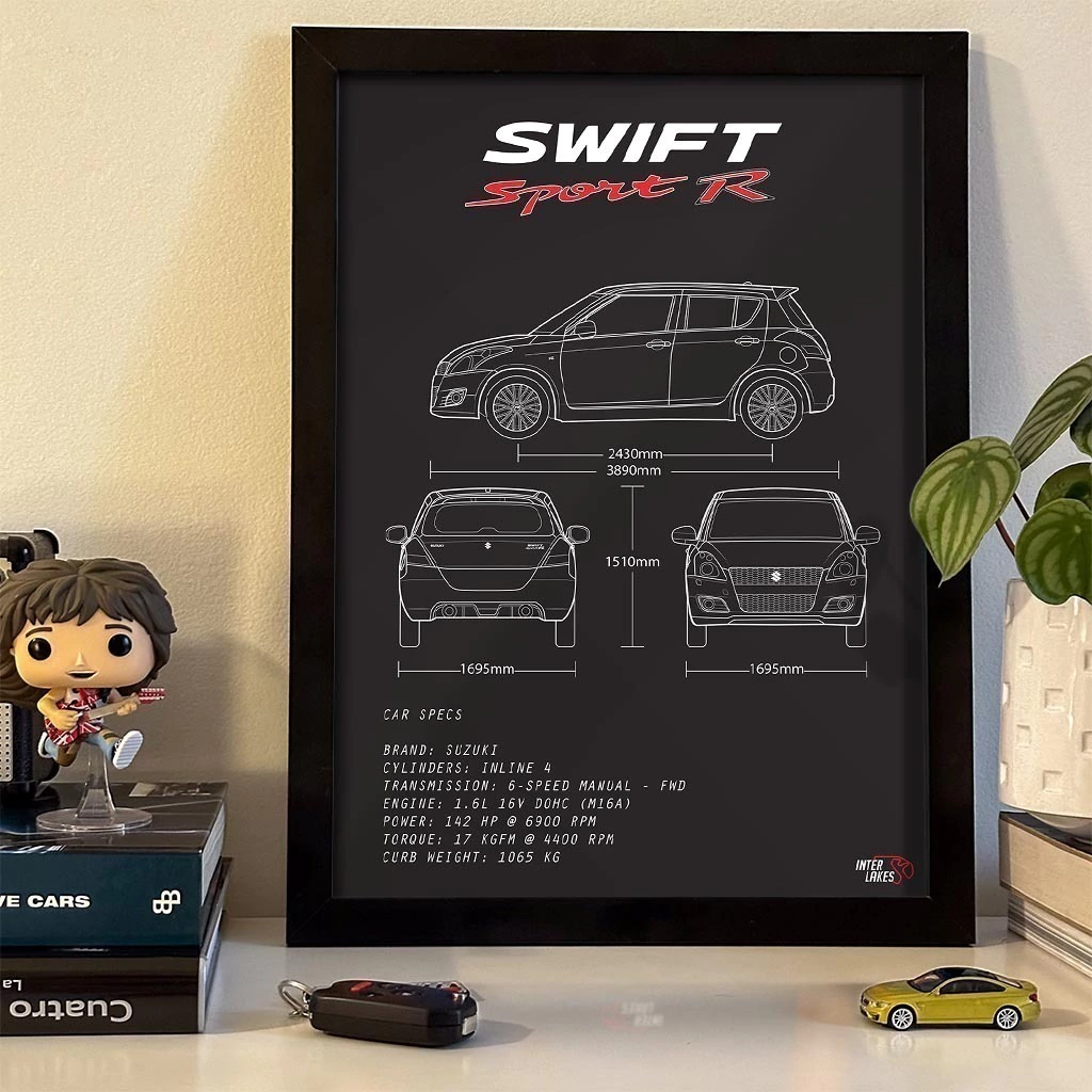 Traga o SUZUKI SWIFT SPORT R 2015 para fazer parte da decoração da sua casa, seja ele uma parte da sua história, esteja na garagem ou ainda exista apenas nos seus sonhos. Eternize a máquina que faz seu coração bater mais forte com um quadro decorativo exclusivo da Interlakes. Este quadro no ESTILO PRETO E BRANCO apresenta uma blueprint/desenho técnico detalhado com as visões lateral, frontal e traseira (front view, side view, rear view) com ficha técnica das especificações do veículo, permitindo que você transforme seu lar em um verdadeiro templo para suas paixões automotivas. Adquira agora esta impressionante arte do SUZUKI SWIFT SPORT R 2015 e eleve o estilo do seu ambiente.